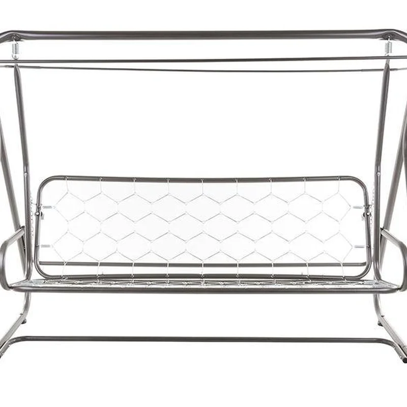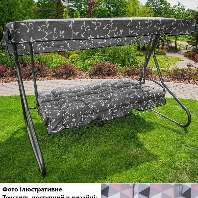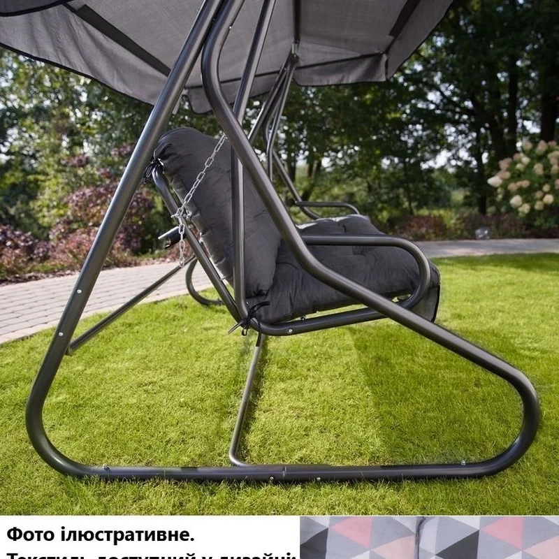 Стійкий дугоподібний каркас, виготовлений із якісної сталі з порошковим покриттям кольору антрацит, забезпечує тривалий термін служби виробу. Подушки-сидіння виконані у сіро-рожевих відтінках із цікавим геометричним принтом, а навіс в універсальному чорному, завдяки чому гойдалка буде чудовим акцентом у дизайні саду, тераси або веранди. Декоративна оборка на нижній частині подушки-сидіння додає особливої грайливості виробу.