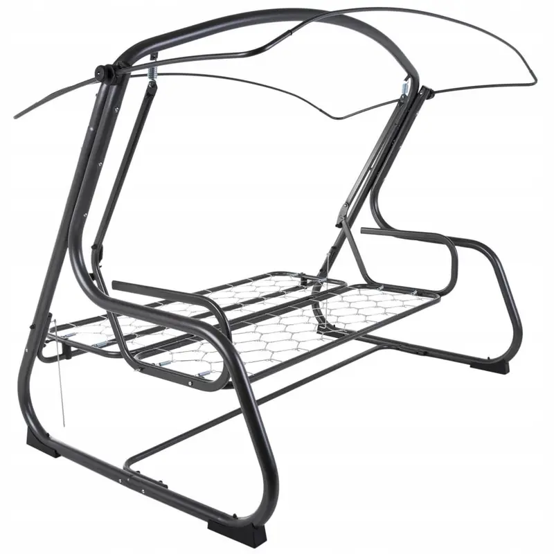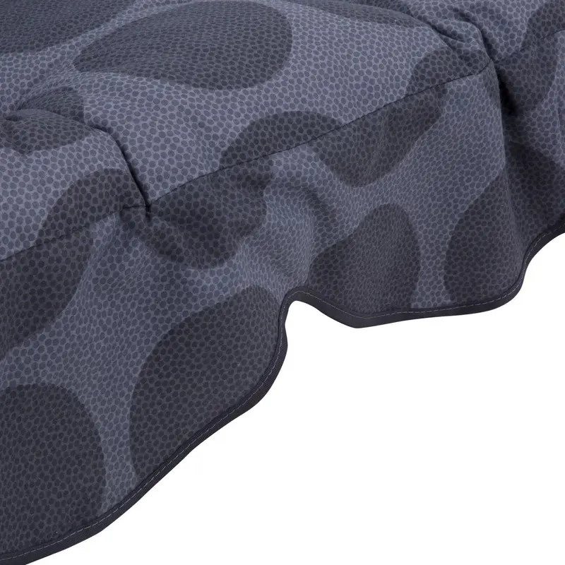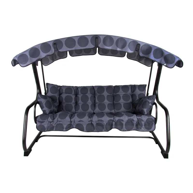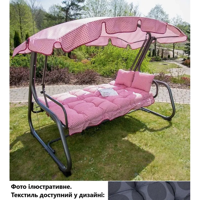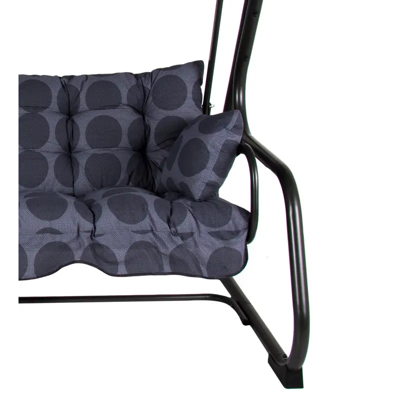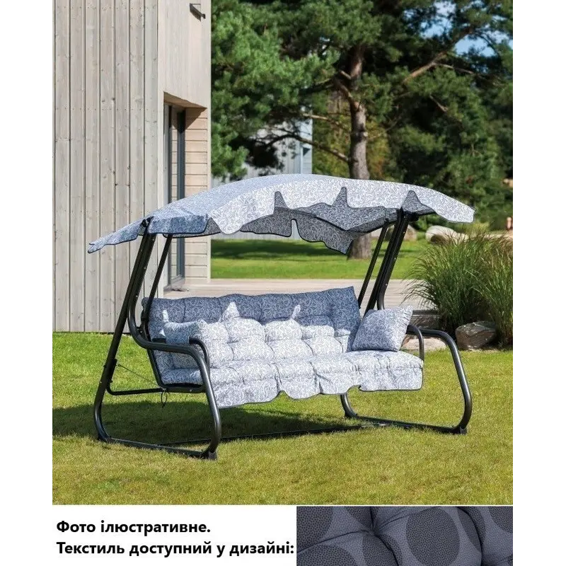 Міцний дугоподібний каркас, виготовлений із якісної сталі з порошковим покриттям кольору антрацит, забезпечує тривалий термін служби виробу. Подушки-сидіння та навіс виконані у текстилі сірих відтінків із принтом у формі куль, завдяки чому гойдалка буде чудовим акцентом у дизайні саду, тераси або веранди.