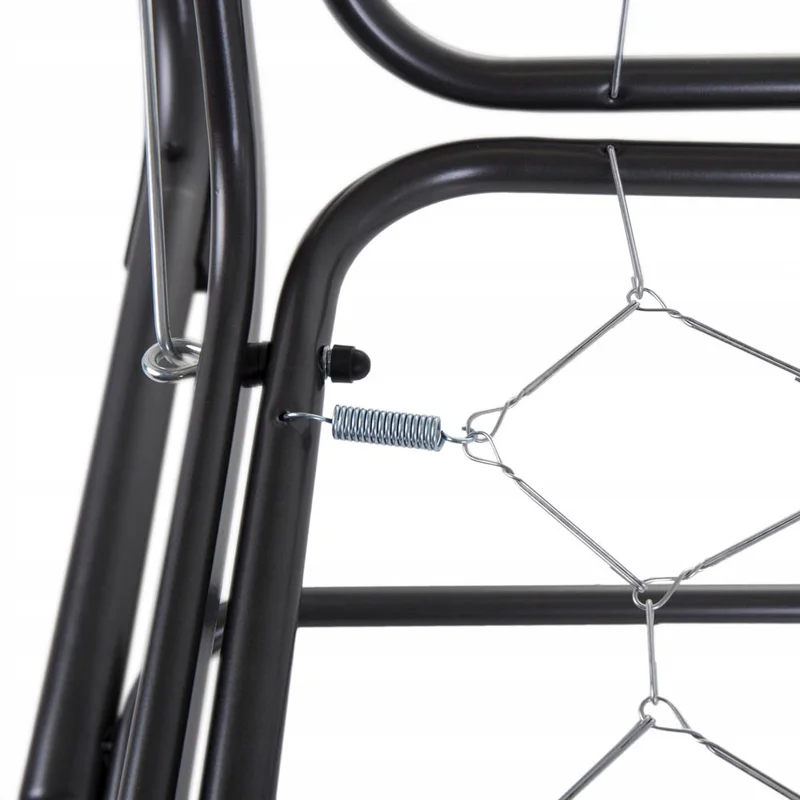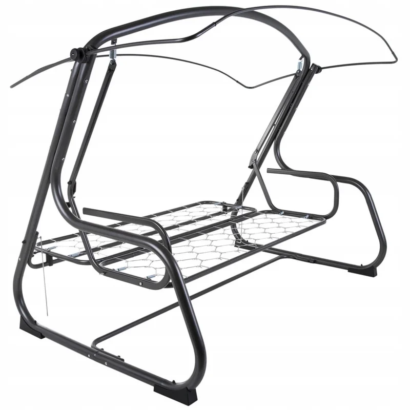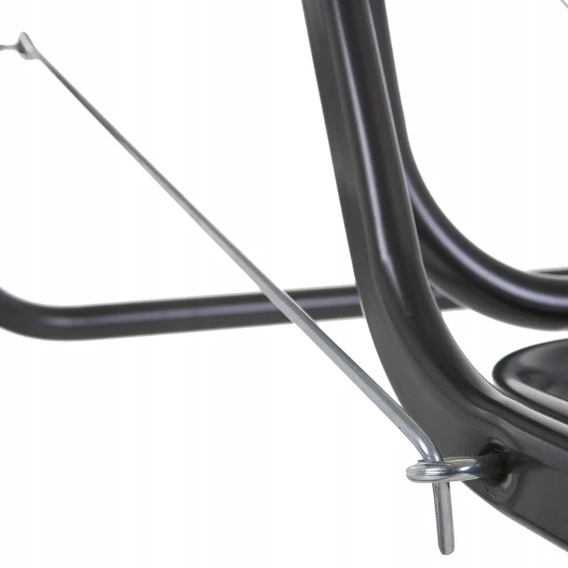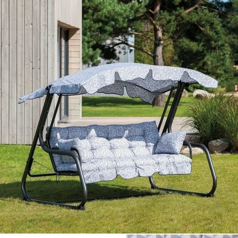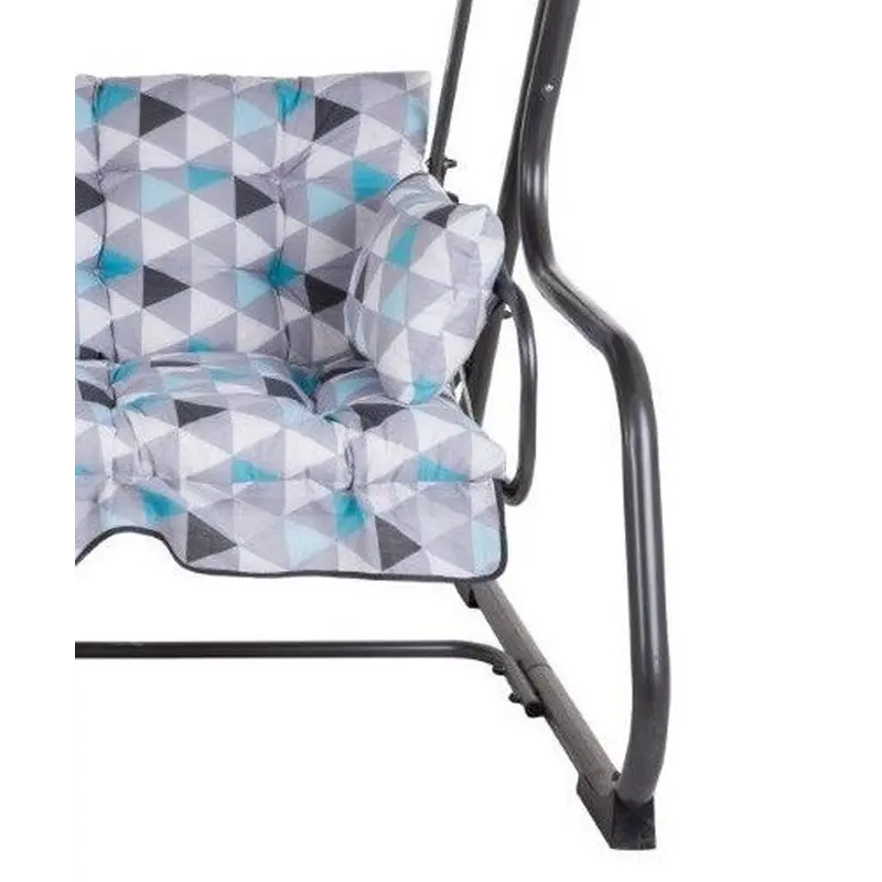 Міцний дугоподібний каркас, виготовлений із якісної сталі з порошковим покриттям кольору антрацит, забезпечує тривалий термін служби виробу. Подушки-сидіння виконані у текстилі з геометричним принтом блакитно-сірих відтінків, а навіс у синьому кольорі, завдяки чому гойдалка буде чудовим акцентом у дизайні саду, тераси або веранди.