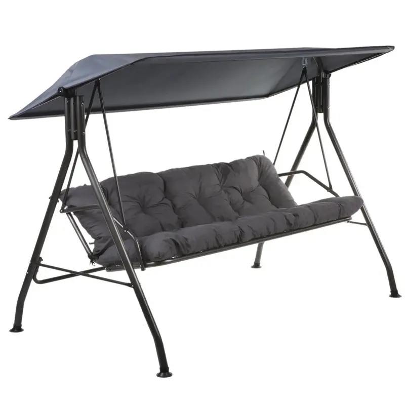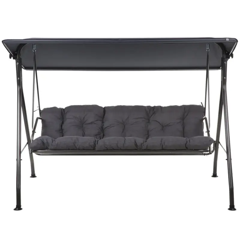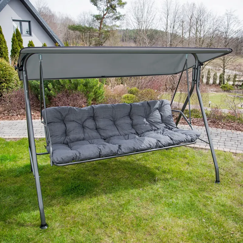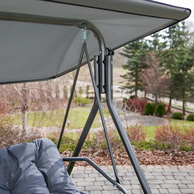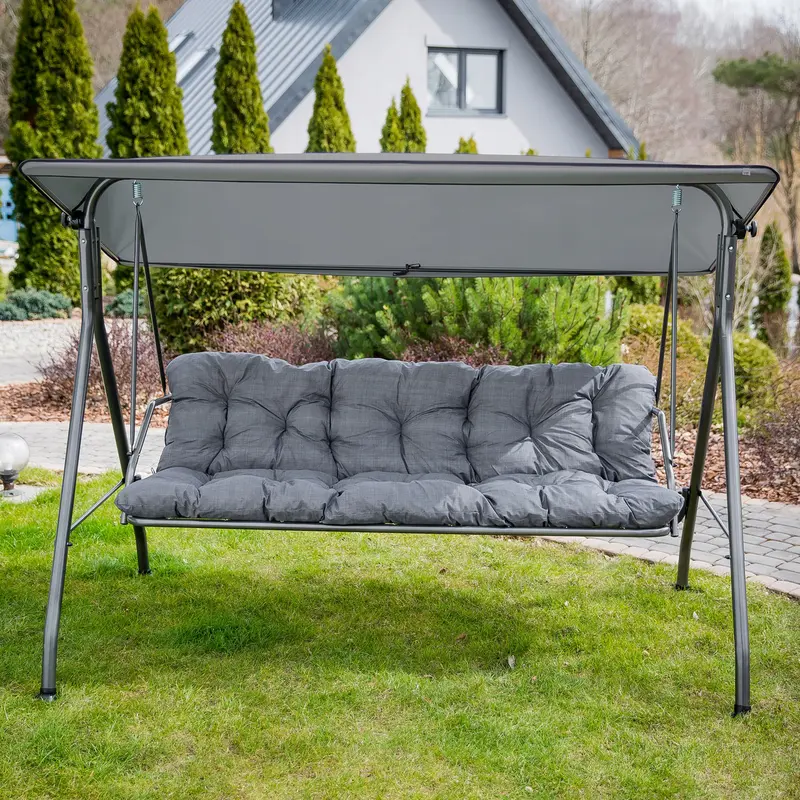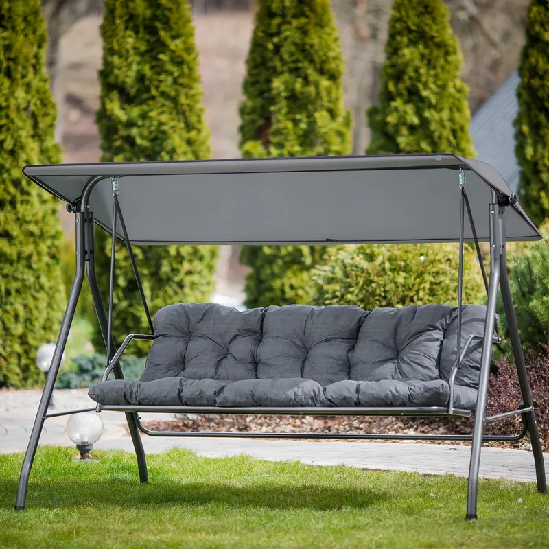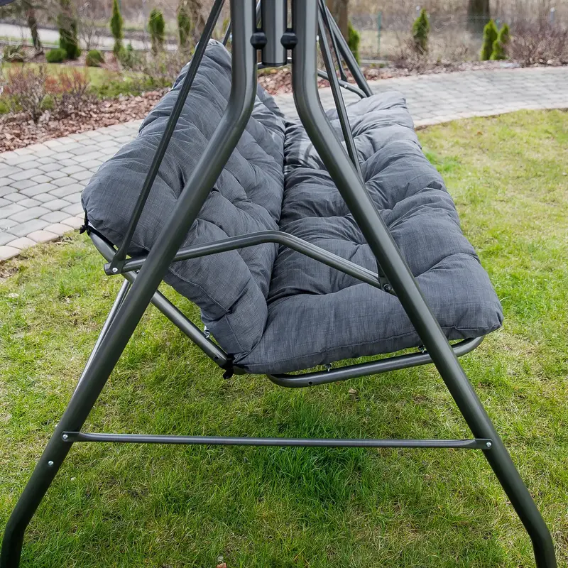 Стійкий каркас на чотирьох ніжках, виготовлений із якісної сталі з порошковим покриттям кольору антрацит, забезпечує тривалий термін служби виробу. Подушка-сидіння та дашок в універсальному й практичному кольорі антрацит, завдяки чому гойдалка чудово впишеться у дизайн саду, тераси або веранди. Навіс із поліестеру захистить від сонячного впливу та опадів.