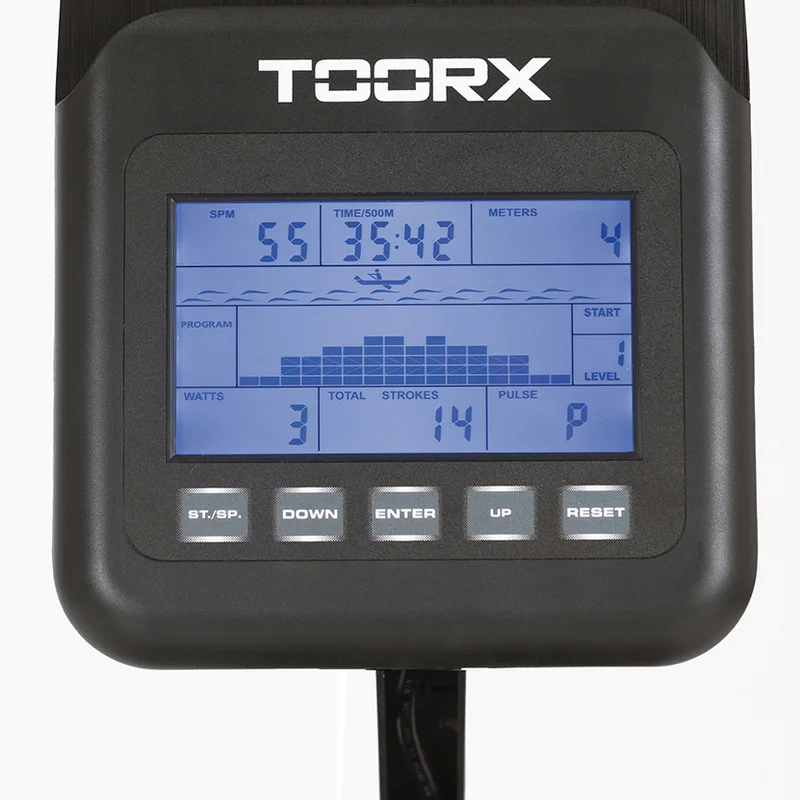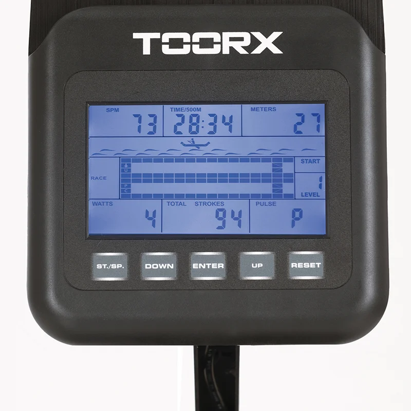 Гребний тренажер Toorx Rower RWX 300 (RWX-300) від італійського виробника Garlando S.p.A. призначений для комплексного кардіотренування в домашніх умовах. Тренажер має 16 рівнів навантаження, що регулюються за допомогою сучасного комп'ютера. 5-кілограмовий маховик завдяки магнітній системі гальмування забезпечує оптимальну амплітуду рухів, а повітряна система опору імітує відчуття веслування на воді. Гребний тренажер розрахований на вагу до 120 кг, а його сидіння на роликах ковзає по алюмінієвій напрямній, гарантуючи необхідний комфорт навіть за тривалих вправ. Вбудований приймач для бездротового датчика вимірювання пульсу буде доречним під час тренування для контролю частоти серцевих скорочень. Складана конструкція тренажера заощаджує місце та дозволяє розмістити його навіть на мінімальній площі, яка потрібна для занять спортом. Консоль тренажера має тримач для смартфона / планшета і підтримує Bluetooth для інтеграції з популярним додатком Kinomap, який перетворить монотонне тренування в захоплюючий процес.
