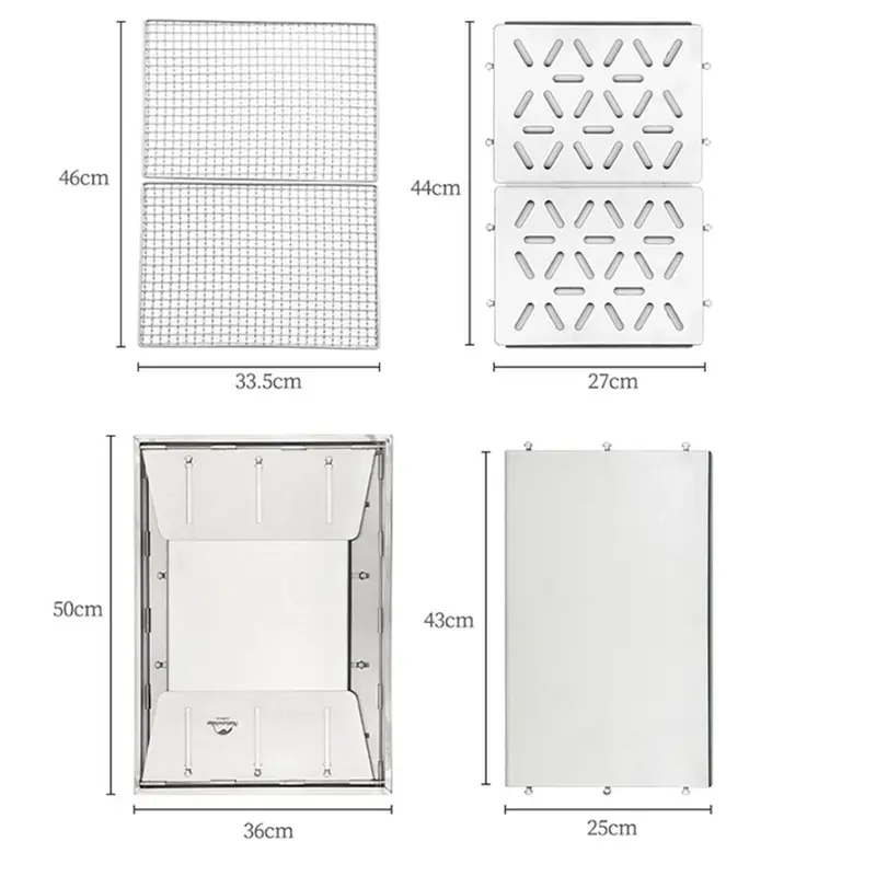 Портативний гриль сталевий. В основі виробу — матова нержавіюча сталь. Ультратонкий корпус, сітка для гриля для харчових продуктів. При виготовленні моделі використовували захищену від корозії сталь марки 304, а також стійку до іржі сталь марки 201. Вага виробу досягає 4.95 кілограма. Габарити складових частин гриля: 50x36x14 см / 33,5x23 см. Габарити сумки для зберігання: 25 x 36 см.