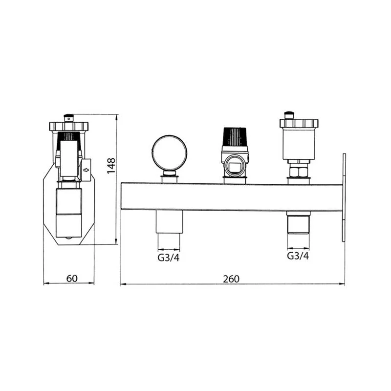Комплектация: автоматический воздухоотводчик, предохранительный клапан и манометр.