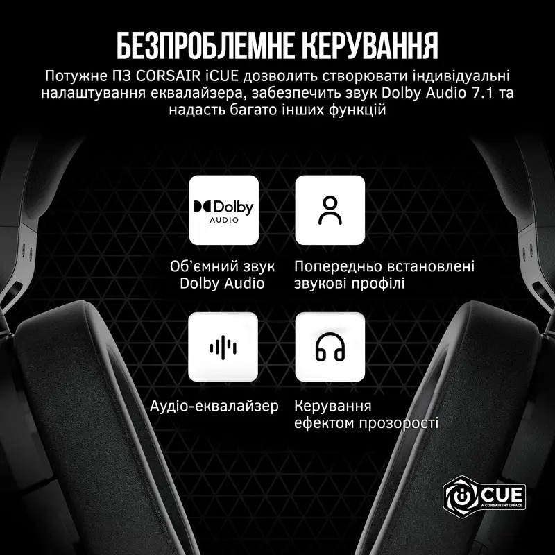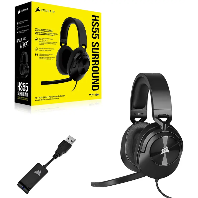Готовність до гри Гарнітура HS55 SURROUND має легку але міцну конструкцію, яку можна з комфортом використовувати для ігор протягом багатьох годин. Комфорт Комфортні амбушюри з м'якого піноматеріалу з ефектом пам'яті та штучної шкіри. Мала вага Вага всього лише 273 г, регульоване оголов'я та амбушюри. Інтуїтивне керування Регулятор гучності на амбушюрі та функція вимкнення звуку на мікрофоні роблять керування дуже зручним. Просторове звучання із ефектом присутності Високоякісні спеціально налаштовані 50-міліметрові неодимові динаміки передадуть аудіосигнал у чудовій якості, а також дозволять розрізнити всі відтінки звуку серед шумів поля битви. Передбачений у комплекті постачання USB-адаптер забезпечує підтримку багатоканального об'ємного звуку Dolby Audio 7.1, що дозволяє повноцінно занурюватися в атмосферу гри. * Підтримка Dolby Audio доступна лише при використанні програмного забезпечення CORSAIR iCUE на ПК та Mac. Кришталево чистий звук Передає голос із неймовірною чіткістю завдяки всеспрямованому мікрофону з функцією вимкнення звуку, сертифікація Discord гарантує ідеальну чистоту та якість передачі звуку. Підключення до практично будь-якого пристрою Використовуйте USB-адаптер із комплекту постачання, щоб забезпечити підтримку об'ємного звуку Dolby Audio 7.1, та отримуйте доступ до інших функцій за допомогою програмного забезпечення CORSAIR iCUE на ПК або Mac. Як варіант, можна використовувати роз'єм 3.5 мм для підключення до ПК, консолі або мобільних пристроїв та швидкого занурення у гру. Безпроблемне керування Потужне ПО CORSAIR iCUE дозволяє створювати налаштування аудіоеквалайзера, забезпечує об'ємний звук Dolby Audio 7.1 і пропонує безліч інших функцій. Об'єднайте свої пристрої CORSAIR iCUE об'єднує ваші налаштування в одну систему, створюючи повністю імерсійну екосистему з інтуїтивним керуванням.