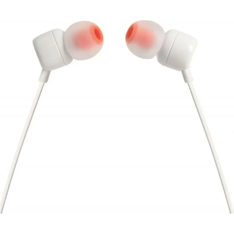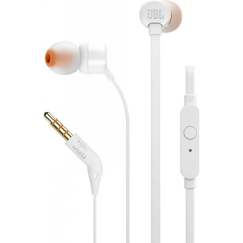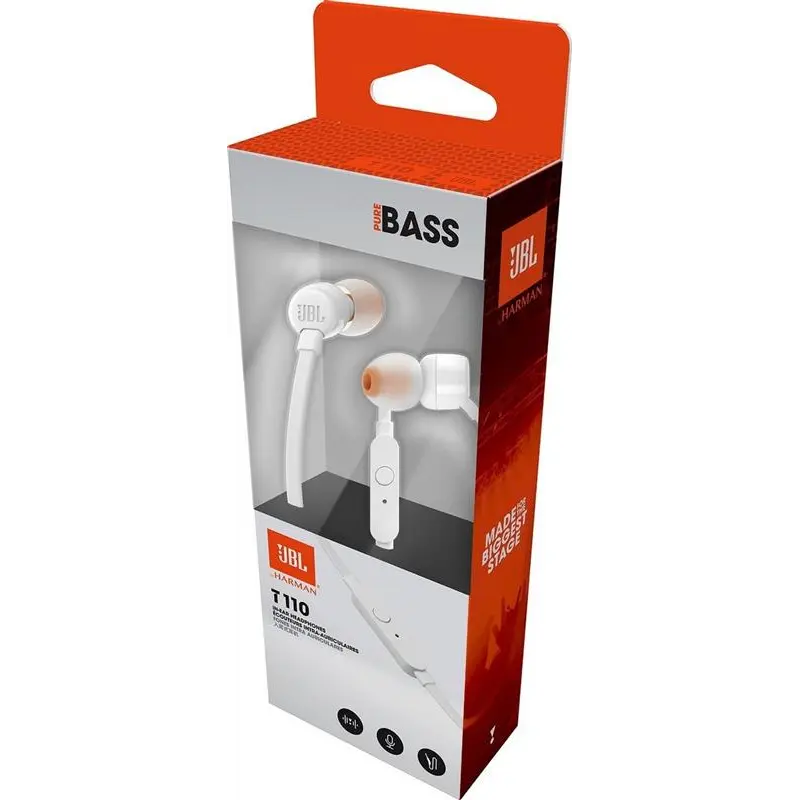 Особливості: Вбудований мікрофон, який дозволяє використовувати пристрій як гарнітуру Навушники підключаються по роз'єму jack 3.5 мм Легковажна конструкція Такий кабель не сплутується під час перенесення або експлуатації Усередині міцного корпусу вушних вкладишів знаходиться пара 9-мм динаміків, здатних видавати потужні баси і відтворювати звук JBL Pure Bass, який можна почути в концертних залах, на спортивних аренах і в звукозаписних студіях по всьому світу. Крім того, однокнопковий пульт управління на плоскому кабелі, що не сплутується, дозволяє керувати відтворенням музики, а також “на ходу” відповідати на дзвінки за допомогою вбудованого мікрофона. Все це робить модель JBL T110 зручним компаньйоном для повсякденного використання на роботі, вдома та в дорозі. Технологія Pure Bass була розроблена інженерами JBL для того, щоб наголосити на енергійності басових партій, які характерні для сучасної музики: під час відтворення низькі частоти акцентуються.