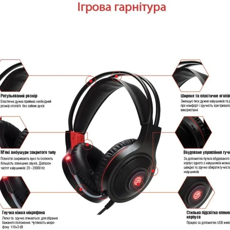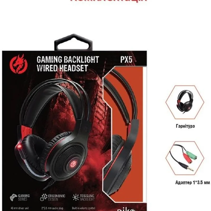 Особливості: - Стильне підсвічування елементів корпусу; - Еластичне м"яке наголів’я; - М'які амбушюри закритого типу; - В комплекті адаптер-перехідник з двох mini-jack на один; - Підходить для всіх моделей ноутбуків; - Регулятор гучності на корпусі одного з навушників; - Гнучка ніжка мікрофона. Ігрова гарнітура Piko PX5 - стильна і комфортна накладна ігрова гарнітура закритого типу, з гнучким мікрофоном, підсвічуванням і розширеної сумісністю. Еластичне м"яке наголів'я приймає форму голови користувача, завдяки чому розмір оголовья можна вибрати без зайвих рухів. Гарнітура підходить для всіх моделей ПК і ноутбуків: вона обладнана двома mini-jack роз’ємами, і укомплектована адаптером-перехідником з двох роз"ємів на один. У свою чергу USB-роз’єм гарнітури використовується для живлення підсвічування елементів корпусу - в будь-який момент користувач може її включити або вимкнути за бажанням.