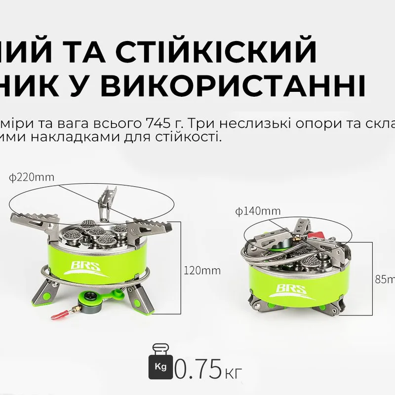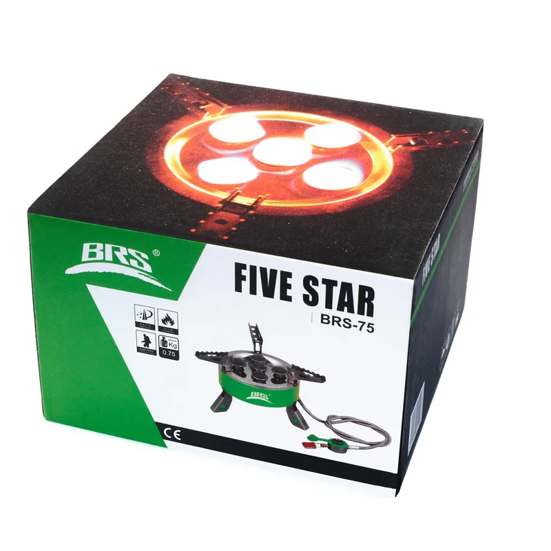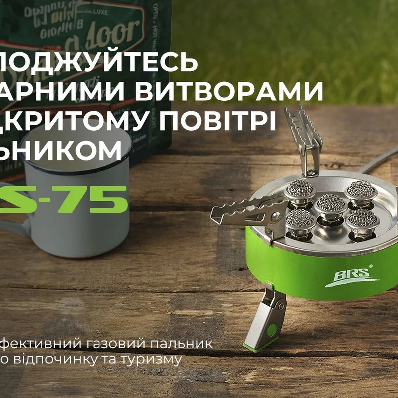Газовий пальник BRS-75 призначений для використання на відкритому повітрі в процесі кулінарії. Призначення – туризм, активний відпочинок. Має значну потужність 7 кіловат. Виготовлена з міцної нержавіючої сталі та алюмінієвого сплаву. П'ять невеликих конфорок для рівномірного розподілу тепла. Регульований клапан для легкого керування потужністю полум'я. Як паливо тут використовується газ бутан.