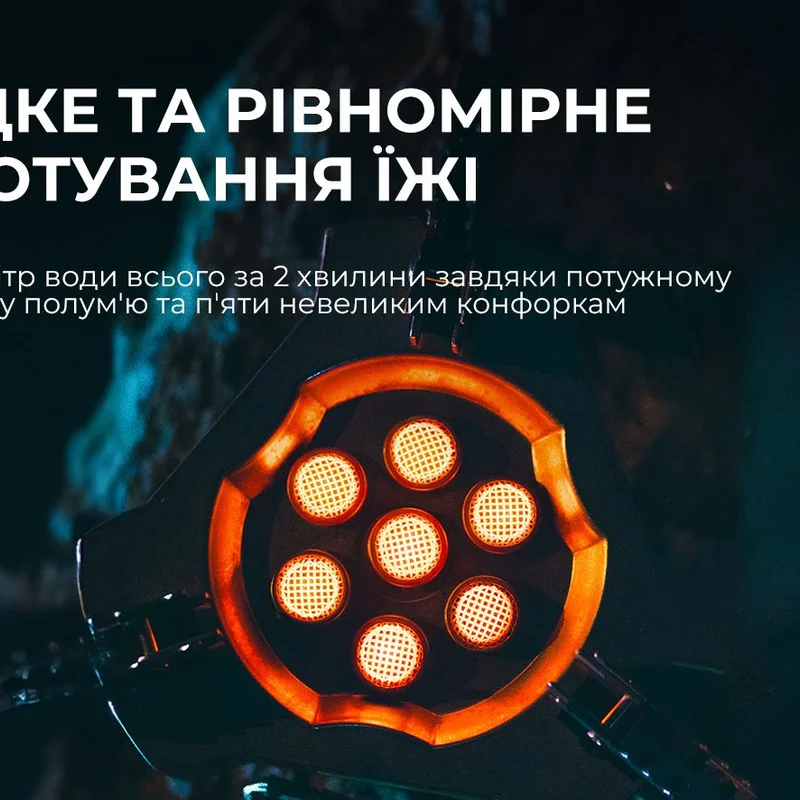 Високоефективна модель допоможе закип'ятити один літр води за кілька хвилин. Три неслизькі складні опори створюють стійку платформу для приготування їжі. Три складні ніжки з гумовими накладками, що не ковзають. Поставляється у футлярі для зручного транспортування.