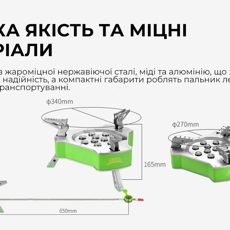 Матеріали: жароміцна нержавіюча сталь, мідь, алюміній. Компактні габарити: розмір моделі становить 270*105 мм, а важить вона 1,85 кг. Висота пальника дорівнює 165 міліметрів. Передбачено сумку для зручного зберігання виробу.