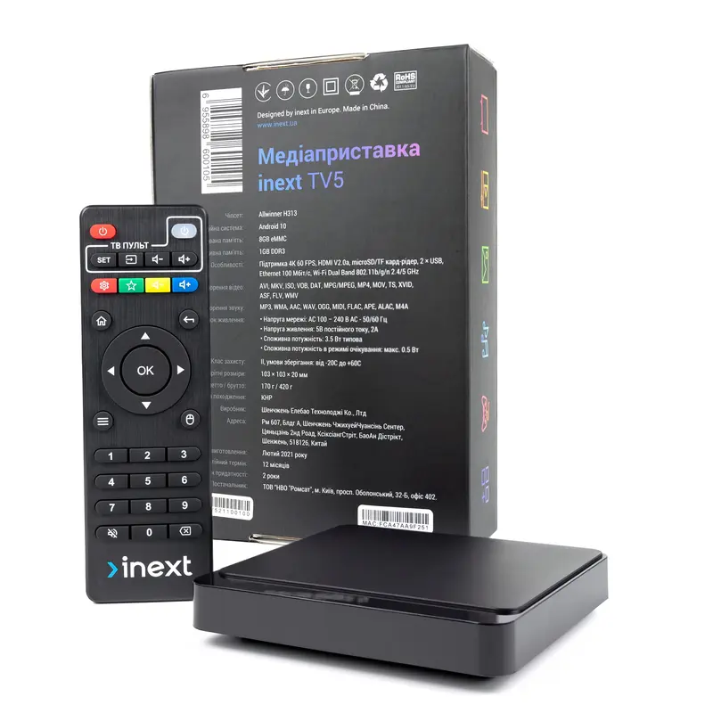 iNeXT TV5 - медіаплеєр з операційною системою Android 10, новим потужним чипсетом Allwinner H313, дводіапазонним модулем WiFi 2.4/5 GHz і можливістю перегляду відео контенту у форматі 4K UHD. Об’єм вбудованої пам’яті становить 8 ГБ, а оперативної пам’яті - 1 ГБ (DDR3). Пристрій створений для комфортного перегляду відео-, фото- та аудіо контенту, має багатий функціонал і широкі можливості підключення. Сучасний мінімалізм Модель inext TV5 - елегантний дизайн, тонкий корпус, представлений у чорному кольорі та компактні габарити. Цей стильний пристрій ідеально впишеться у будь-який інтер’єр. Новий чипсет Allwinner H313 Завдяки новому потужному чипсету Allwinner H313 ви можете насолоджуватися максимально реалістичним зображенням з відмінною деталізацією при перегляді 4К контенту з частотою 60 кадрів на секунду. Новий чипсет - це швидка робота, плавна навігація та бездоганне відтворення контенту. Дводіапазонний WiFi модуль Найвищу швидкість передачі інформації та стабільний сигнал забезпечує вбудований дводіапазонний модуль WiFi. Завдяки Wi-Fi 2.4/5 GHz ви зможете швидко, без затримок і підвисань, переглядати потокові відео з роздільною здатністю 4K, не заповнюючи кімнату зайвими проводами. Все що необхідно для підключення inext TV5 - інтернет. Android 10 Плеєр працює на адаптованій операційній системі Android 10. Дана ОС має сучасний та зручний інтерфейс, широкі можливості налаштування головного екрану, а також, відрізняється високою стабільністю й продуктивністю. Зручне управління зі смартфона Крім стандартного пульта, управляти плеєром можна за допомогою програми Android TV Remote Control на вашому смартфоні, в ній доступні голосовий пошук і віртуальна клавіатура. Просто завантажте цю програму та керуйте приставкою з телефону. Також, є можливість підключення USB-миші та USB-клавіатури. Пульт дистанційного керування програмований. Для зручності, улюблений додаток можна закріпити на спеціальній кнопці основного пульта. Контент без меж Переглядайте фільми, національні канали та серіали через встановлені ТВ-сервіси. Море відео контенту, популярні музичні кліпи, або ж онлайн-трансляції, дивіться на YouTube. Завдяки встановленому Play Market ви зможете завантажувати безліч додатків та ігор. Насолоджуйтесь улюбленим контентом у зручний для вас час. Широкі можливості підключення Медіаплеєр iNeXT TV5 оснащений інтерфейсом HDMI 2.0 для відтворення відео контенту з частотою 60 кадрів на секунду. На борту присутній роз’єм S/PDIF для відтворення багатоканального звуку, а також, 2 USB порти та слот для карт пам’яті microSD/TF, для підключення зовнішніх носіїв інформації. Можливості iNeXT безмежні - підключайте приставку до телевізора та інтернету для телепортації у захоплюючий світ розваг!