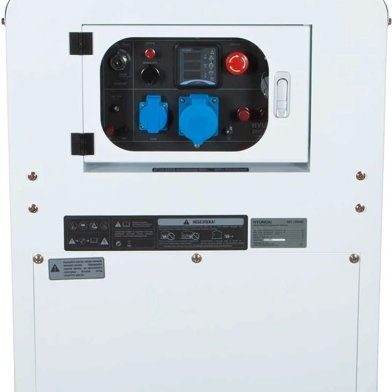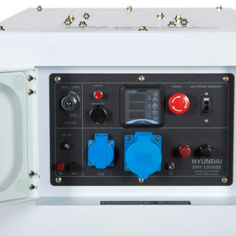 Фірмовий двигун зі збільшеним моторесурсом та потужністю: Збільшена зносостійкість блока циліндрів, що дозволило збільшити моторесурс двигуна до 3500 мотогодин без капітального ремонту; Використання якісних матеріалів в поєднанні з надійною системою фіксації клапанів, що гарантує надійну та довговічну роботу двигуна; Надійний масляний насос завжди забезпечує бездоганне змащування поршневої групи; Високоякісний повітряний фільтр забезпечує надійну фільтрацію повітря для утворення паливної суміші. Система запуску EASY START - використовується автоматично для полегшеного запуску генератора. Альтернатор - усі генератори Hyundai комплектуються тільки синхронними альтернаторами з мідною обмоткою. Обмотка з міді не перегрівається, витримує більші навантаження у порівнянні з іншими матеріалами, володіє відмінною струмовіддачею. Виготовляються на автоматичній лінії, що унеможливлює присутність дефектів пов’язаних з людським фактором, також застосовано поліпшене укладання проводів з додатковою фіксацією обмоток та якісною лаковою заливкою проводів. Балансування ротора проводиться під динамічним навантаженням на високоточному обладнанні із застосуванням електронної системи вимірювання симетрії. Також в дизельних генераторах даної серії використана система подвійного захисту обмоток альтернатора від перевантаження. Панель керування генератора - повністю оновлений багатофункціональний цифровий дисплей є не тільки інформаційним, а в першу чергу виконує функцію надійного захисту генератора від перевантажень, та захищає під’єднані до генератора споживачів, від таких неприємностей як, стрибки напруги, струму, частоти, навіть попереджує користувача про низький заряд акумулятора. На панелі керування встановлено: 1. Цифровий дисплей нового покоління надає інформацію про: 1.1 Захист - новий цифровий дисплей захищає від: напругу (V); струм (А); частоту (Hz); загальні мотогодини; стан акумулятора; температуру навколишнього середовища; температуру двигуна; режим роботи (автоматичний / ручний); помилки в стані роботи генератора. Перевантаження; Надвисого струму; Відхилення частоти (високої чи низької); Відхилення напруги (високої чи низької); Відхилення напруги акумулятора (високої чи низької). 1.2 Керування: Кнопка перемикання режимів роботи (автоматичний / ручний); Кнопка запуску генератора; Кнопка зупинки генератора; Кнопка входу до меню налаштувань; 4 кнопки зі стрілками для навігації в системі перегляду даних та налаштування. 2. Силові контакти для підключення повного навантаження потужністю 11кВт (для 220В) 13,75кВА (для 380В); 3. Для 220В - розетка 230В/16А та розетка 230В/32А, для 380В - розетка 400В/32А та розетка 230В/16А; 4. Вихід 12 V (з тепловим запобіжником від перевантаження); 5. Замок запалення; 6. Тепловий захист звичайної розетки (16А); 7. Вихід для під’єднання заземлення; 8. Кнопка аварійної зупинки двигуна; 9. Кнопка ввімкнення свічки розжарення; 10. Роз'єм підключення блоку ATS. AVR - виготовлена серійно, встановлені конденсатори підвищеної ємкості, та герметично заповнена компаундом для захисту від зовнішнього середовища. Інтелектуальна система захисту - створює оптимальні умови використання джерела струму в робочому діапазоні. Гарантовано генерує максимально вказану потужність. Система поліпшення запуску двигуна у зимовий період - встановлена на 
