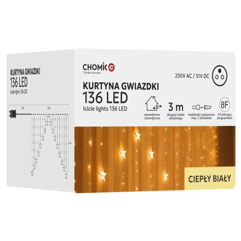 Гірлянда електрична Chomik "Штора зірки" 136 LED, теплий білий, 3м, від мережі