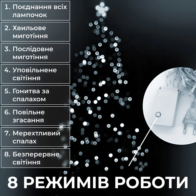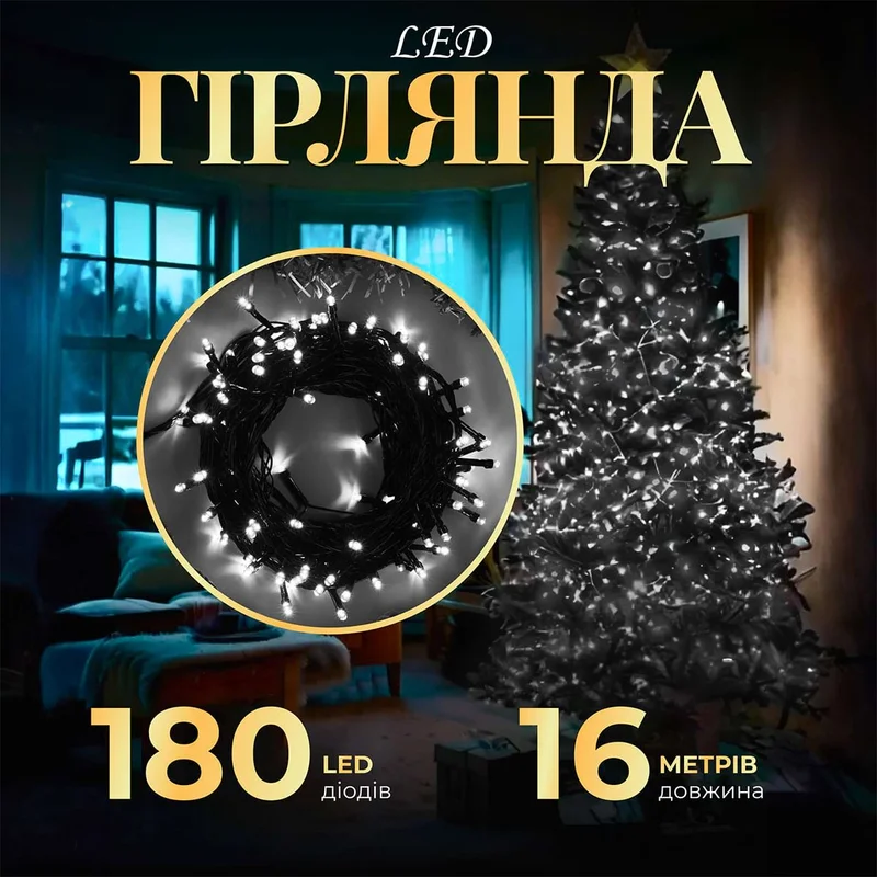 Гірлянда нитка 16м на 180 LED лампочок світлодіодна чорний провід 8 режимів роботи Білий