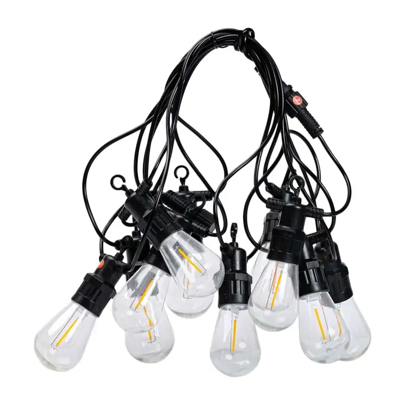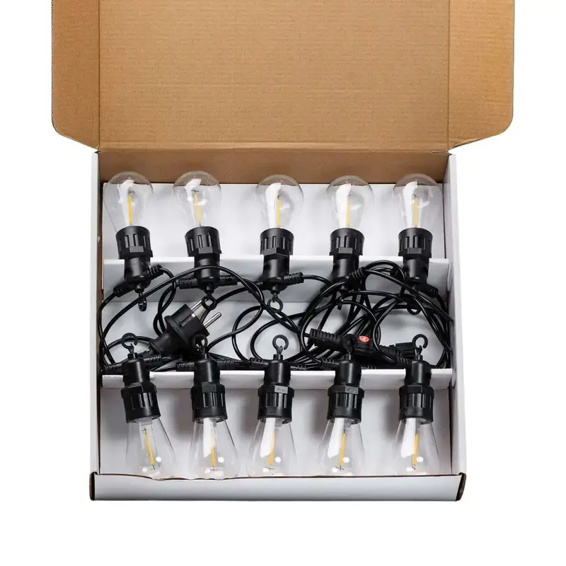 Вулична гірлянда у ретро-стилі створить теплу та затишну атмосферу у вашому саду чи будинку. Її класичний дизайн ідеально підходить для прикраси альтанок, веранд, дерев, чагарників, а також екстер'єру кафе та ресторанів. Гірлянда може використовуватись як стильний елемент інтер'єру або додаткове освітлення у приміщеннях. Водонепроникність IP43 забезпечує захист від дощу, снігу та вологи, що робить її універсальною для використання як всередині, так і зовні. Характеристики: Кількість лампочок: 10 Довжина: 5 м Напруга: 220 В Кут світіння: 300 ° Колір: жовтий Цоколь: E27 Переваги: Створює затишну атмосферу для святкових заходів. Високий клас водонепроникності для надійності в будь-яку погоду. Легко встановлюється та підходить для різних типів оформлення. Заходи безпеки: Уникайте використання в місцях із високою вологістю без належного захисту. Не розбирайте та не модифікуйте гірлянду без консультації з фахівцем.