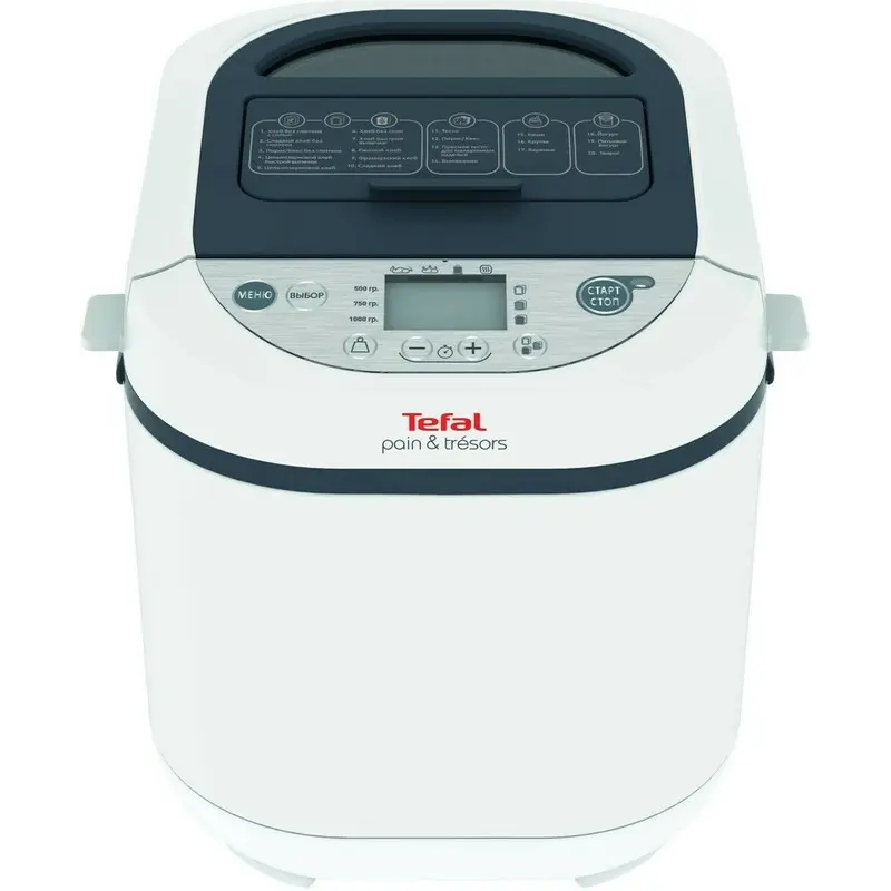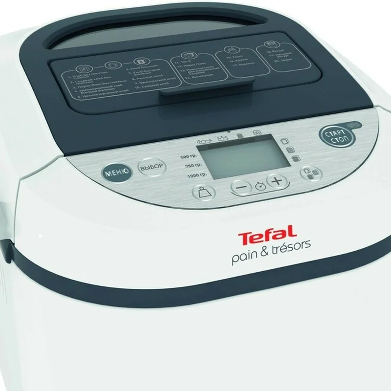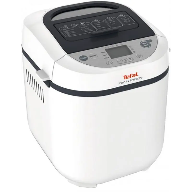 Pain & Trésors PF250135: найдосконаліша та найуніверсальніша хлібопічка від Tefal. Насолоджуйтеся свіжим, смачним домашнім хлібом та іншими смаколиками. 20 автоматичних програм. 20 автоматичних програм для легкого приготування домашнього хліба та багато чого іншого: тістечка, макарони, тісто для піци, джем, каші, пластівці, йогурт, питний йогурт і сир. Включає 3 програми без глютену. Родзинка для ваших страв. Додайте у свої продукти горіхи, родзинки або шоколадну стружку за допомогою автоматичного дозатора. Свіжий хліб всього за кілька кроків. Усе в автоматичному режимі! Помістіть інгредієнти у форму для хліба, виберіть програму, і хлібопічка зробить всю роботу за вас - від замішування до випічки! Слідкуйте за процесом приготування за допомогою широкоекранної панелі для чіткої індикації параметрів і часу! 3 налаштування ваги та 3 рівні підрум'янювання. Від 500 г до 1 кг хліба для великої або маленької порції. Виберіть колір скоринки: від злегка просмаженої до дуже хрусткої. Готуйте домашні молочні продукти. У спеціальній каструлі приготуйте до 1 л йогурту. Використовуйте фільтр, що входить до комплекту, щоб приготувати сир. Свіжоспечений хліб у будь-який час. Відкладений старт до 15 годин і функція автоматичної підтримки тепла протягом 1 години. Легко використовувати / Легко чистити. Знімне деко для хліба з антипригарним покриттям для полегшення виймання хліба. Його можна мити в посудомийній машині. Книга рецептів у комплекті. У книзі рецептів представлений традиційний хліб, а також більш вишуканий хліб, наприклад, смажений томатний хліб або віденський шоколадний хліб! Для тих, хто піклується про своє здоров'я, є рецепт безсольового, морквяного хліба, смачного і легкого каштанового пирога. Книга рецептів також включає поради та прості правила для досягнення бажаних результатів випічки.