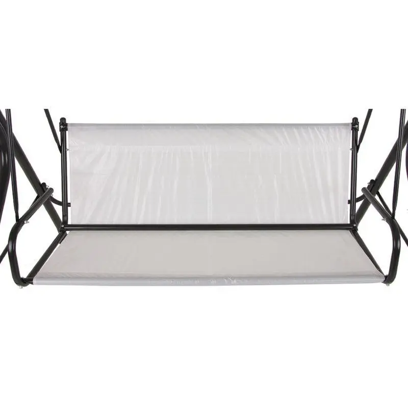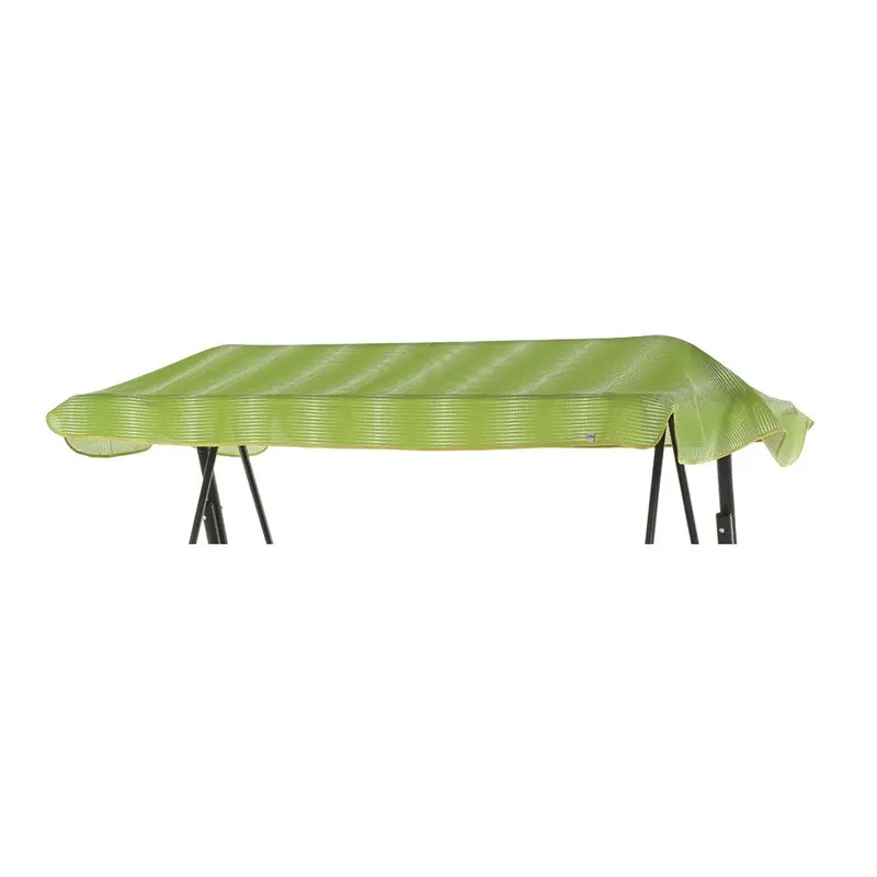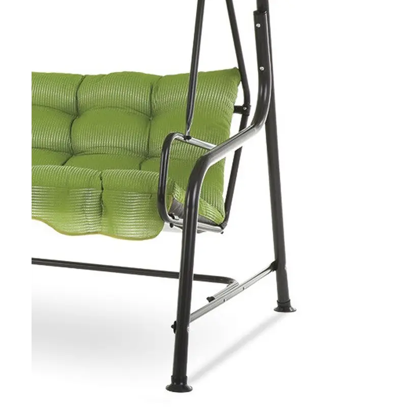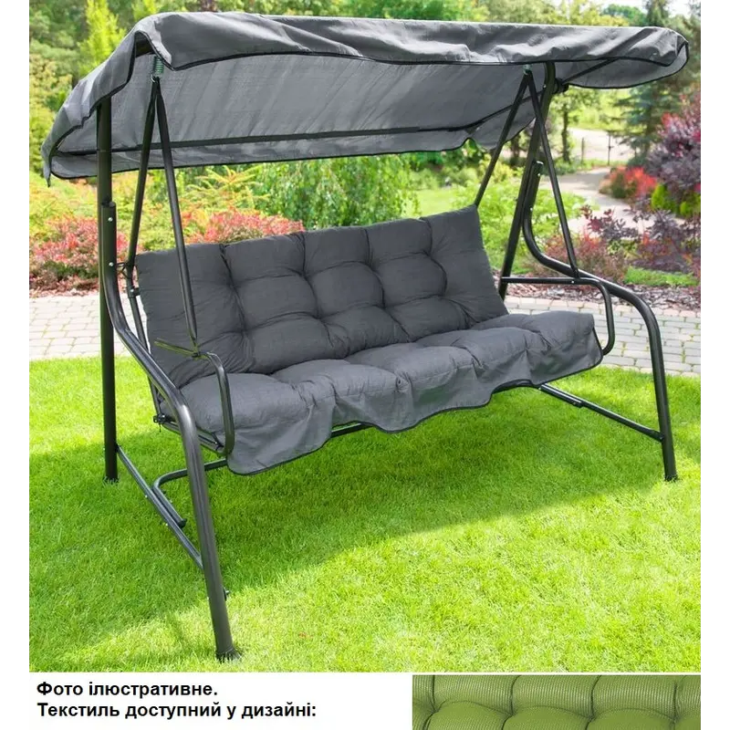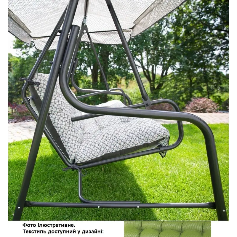 Стійкий каркас на чотирьох ніжках, виготовлений із якісної сталі з порошковим покриттям кольору антрацит, забезпечує тривалий термін служби виробу. Подушки-сидіння та навіс виконані у зеленому текстилі із білими вкрапленнями, завдяки чому гойдалка чудово впишеться у дизайн саду, тераси або веранди. Декоративна оборка на нижній частині подушки-сидіння додає особливої грайливості виробу. Навіс з поліестеру захистить від сонячного впливу та опадів.