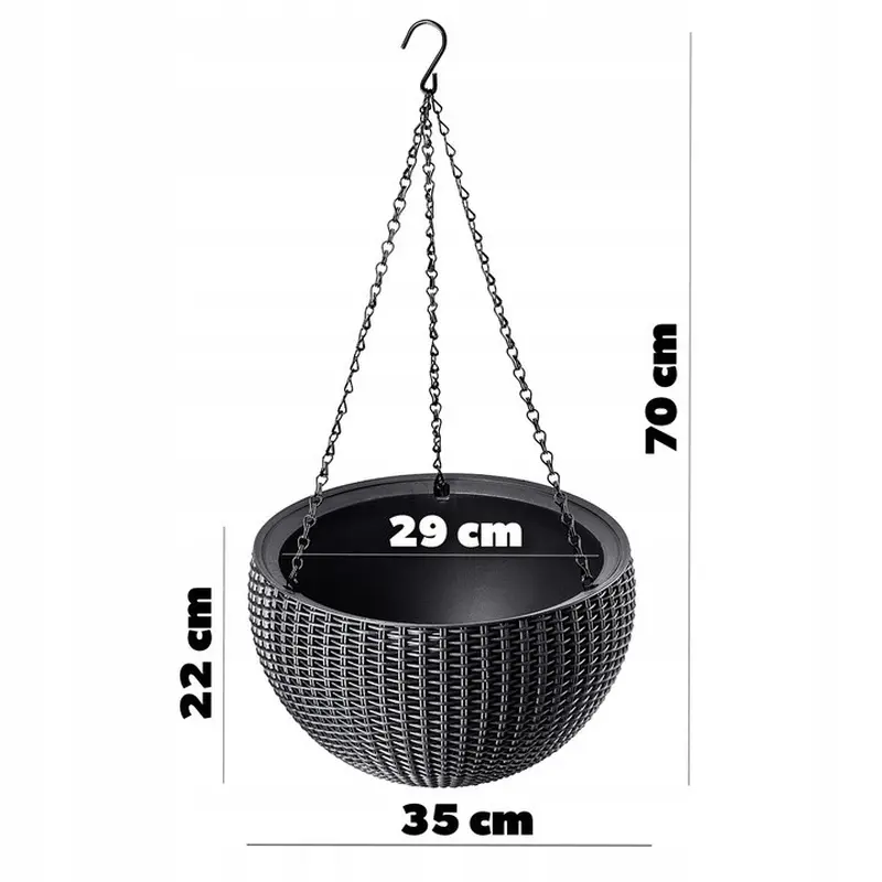 Сферична форма у поєднанні зі стильною зовнішньою поверхнею, що нагадує плетіння ротангу, роблять підвісний Горщик для рослин Keter Rattan hanging sphere з ланцюжками, 8,6 л у кольорі антрацит цікавим та елегантним водночас.