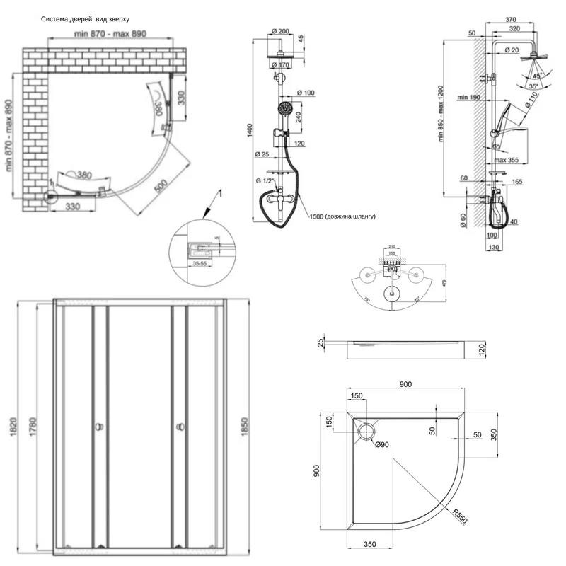 Готове рішення Qtap 1: Душ. кабіна півколо., 90x90 + Піддон + Душ. панель