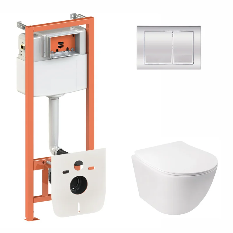 Набір Qtap інсталяція 3 в 1 Nest QT0133M425 з квадратною панеллю змиву QT0111M06028CRM + унітаз з сидінням Jay QT07335176W є зручним рішенням для сучасного санвузла. Він комплектується унітазом, сидінням, інсталяційною рамою, панеллю змиву, звукоізоляційною прокладкою. Завдяки застінному монтажу інсталяції та підвісної конструкції унітазу цей комплект зробить Ваші гігієнічні процедури комфортнішими, а прибирання не завдасть зайвого клопоту.