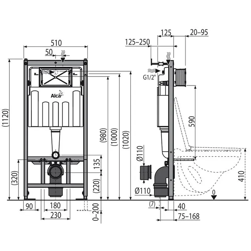 Инсталляция AM101/1120 с панелью смыва M678 и звукоизоляционной прокладкой M91 от компании Alca Plast предназначена для подвешивания унитазов с интервалом крепления 180 мм или 230 мм к гипсокартонновым конструкциям.
