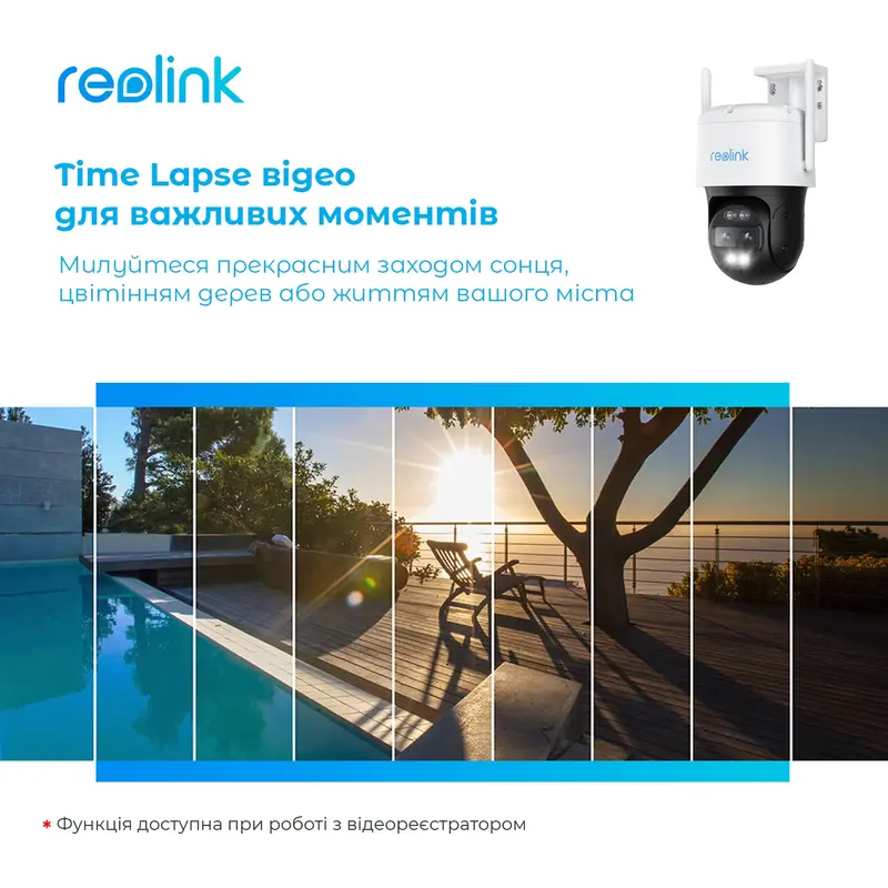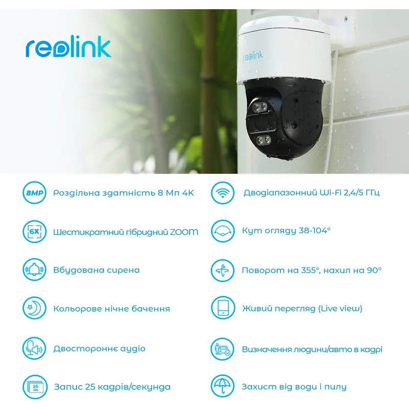 Reolink TrackMix WiFi Розумна 8 Мп PTZ Wi-Fi камера відеоспостереження з прожектором Розпізнавання людей/авто | ZOOM 6x | Двосторонній аудіозв’язок | Кольорове нічне бачення | Wi-Fi 5 ГГц/2,4 ГГц Розпізнавання людей/транспортних засобів/домашніх тварин Аналізуючи форми об'єктів, TrackMix WiFi може точно розпізнавати людей, транспортні засоби та тварин*. При виявленні підозрілої особи вам відразу буде надіслано сповіщення про небезпеку. Це значно знижує кількість помилкових тривог, оскільки рух інших, менш важливих об'єктів, ігноруються. *У даний час функція виявлення домашніх тварин знаходиться на стадії тестування Подвійне попередження Коли TrackMix WiFi фіксує підозрілий об'єкт, її прожектори та сигналізація вмикаються або активуються вами вручну. Попередьте незванного гостя та зупиніть злочин до його скоєння. Вбудована сигналізація Прожектор Двосторонній аудіозв’язок: більш комфортне та просте спілкування Вбудовані мікрофон та динамік дозволяють слухати та говорити з тим, кого зафіксує камера у режимі реального часу. Ви можете привітатися з друзями або зробити попередження недоброзичливцям. Двохдіапазонний Wi-Fi Дводіпазонний Wi-Fi з підтримкою діапазонів 5 ГГц або 2,4 ГГц дозволяє працювати у менш зашумленому діапазоні і отримувати стабільний якісний зв'язок. Камера оснащена потужними антенами 2T2R MIMO з робочим діапазоном до 50 м (на відкритій місцевості). Стеження за об'єктом та патрулювання Завдяки панорамуванню на 355° та нахилу на 90°, камера TrackMix може контролювати досить велику територію за допомогою всього однієї камери відеоспостереження. Вона також може автоматично слідкувати за рухом людини/транспортного засобу. Автоматичне відстеження Ручне та автоматичне панорамування та нахил Висока чіткість зображення (8 Мп) TrackMix WiFi — це про якісне та надчітке зображення. Насолоджуйтесь якісними фотографіями та відео, знятими на вашу камеру відеоспостереження. Ви можете легко розглянути важко-помітні деталі, які зафіксовані камерою. Супер чітке нічне бачення Камера TrackMix WiFi з інфрачервоними світлодіодами бачить вночі на відстань до 15 метрів. Світло прожекторів забезпечує нічне бачення у кольорі як при денному світлі. 6-кратний гібридний зум для більшого огляду Її подвiйний об'єктив забезпечує широкий кут огляду, а 6-кратний оптичний зум дозволяє наблизити зображення для розгляду дрібних деталей або зменшити його для максимального охоплення. Кут огляду 38 ° – 104 ° Ширококутний об'єктив – 2,8 мм Телефотооб'єктив – 8 мм Дивовижні відео за допомогою інтервальної зйомки За такими тривалими подіями, як схід сонця чи розпускання квітів, спостерігати важко, але цікаво. Ця камера з функцією інтервальної зйомки дозволяє швидше і простіше зняти динаміку таких прекрасних і цікавих подій. Міцніша, ніж ви очікуєте TrackMix WiFi призначена для використання в різних умовах. Міцний корпус дозволяє цій камері витримувати потужні струмені води, сильну спеку, вологість та холод. Контролюйте свій дім або бізнес за допомогою мобільних застосунків За допомогою застосунків, таких як Reolink App або Client, ви можете тримати під контролем ваш будинок або бізнес, відреагувати на тривогу у будь-яку годину та з будь-якого місця. Просте відтворення та керування записами Ви можете не тільки відтворювати збережені відео для пошуку потрібної вам інформації, а й фільтрувати відео за моментами розпі