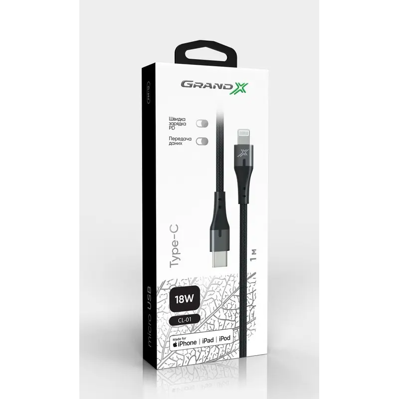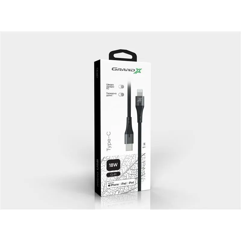 Кабель Grand-X USB Type-C - Lightning (M/M), MFI, Power Delivery 18W, 1 м, Gray (CL-01)