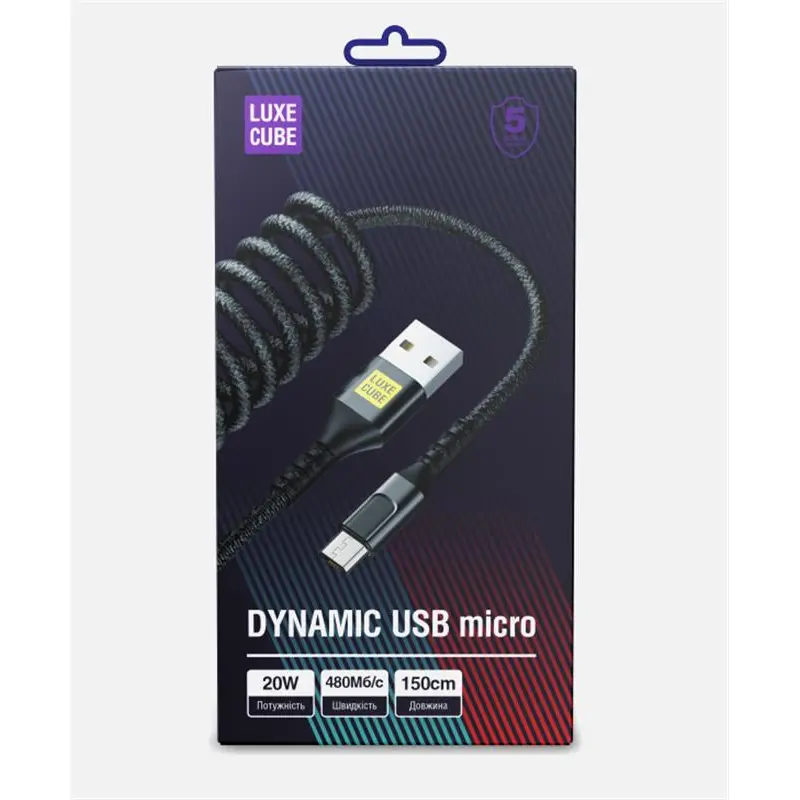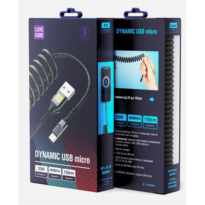 Витий кабель подовжуеться від 20 до 150 см. У згорнутому стані не заважає та не створює безлад в авто чи вдома. Система Запобігання Деформації зміцнює точки напруги, витримуючи до 30 000 згинань, що робить кабель LUXE CUBE набагато витривалішим, ніж звичайні кабелі. 20 W – Підтримує швидкісну зарядку