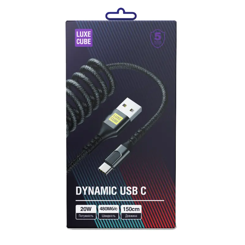 Витий кабель подовжуеться від 20 до 150 см. У згорнутому стані не заважає та не створює безлад в авто чи вдома. Система Запобігання Деформації зміцнює точки напруги, витримуючи до 30 000 згинань, що робить кабель LUXE CUBE набагато витривалішим, ніж звичайні кабелі. 20 W – Підтримує швидкісну зарядку