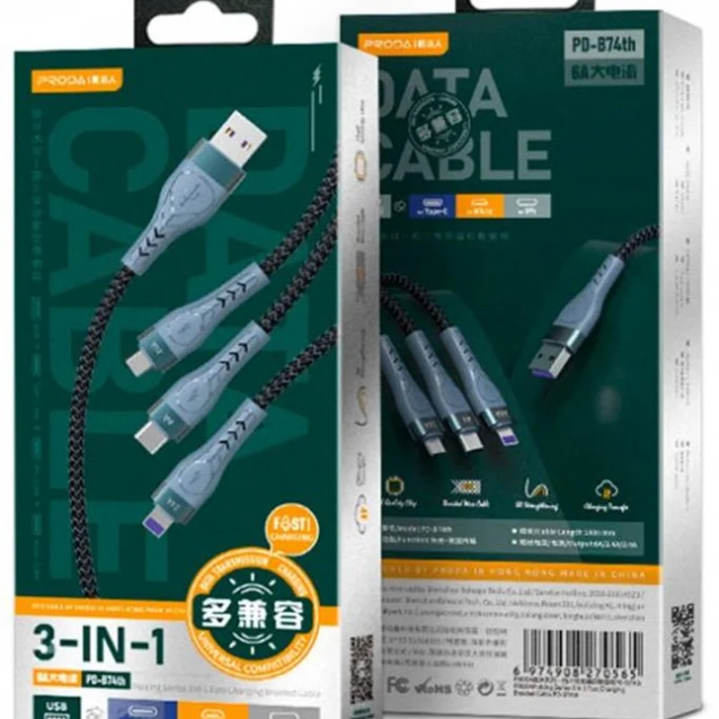 Особливості: Стильний дизайн Високоміцний якісний та стійкий до зламів провід. Функція передачі даних відсутня Кабель має міцне нейлонове обплетення з вогнестійкого матеріалу. Матеріал з’єднання: алюмінієвий сплав Характеристики: Бренд: Proda Довжина: 1.3 м Максимальний струм: 6 А MicroUSB: 2.4 А Lightning: 2.4 А Type-C: 6 А Матеріали: алюмінієвий сплав + плетений кабель Тип підключення: MicroUSB (Android) + Type-C (Android) + Lightning (iPhone)