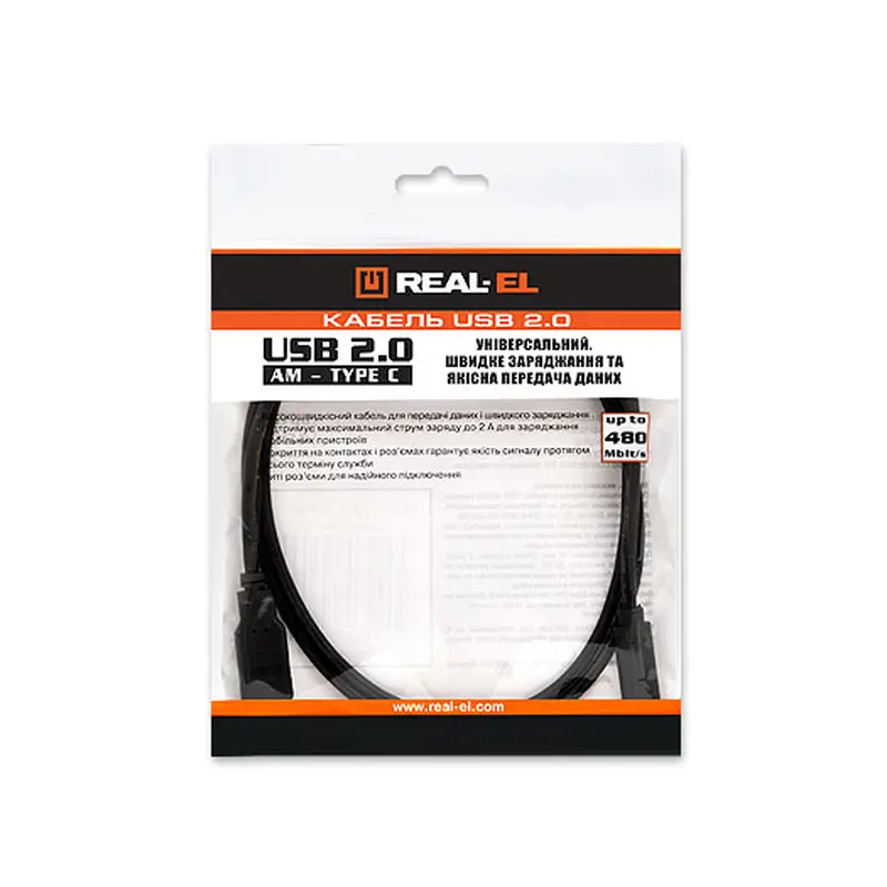Кабель REAL-EL USB 2.0 AM-type C служить для підключення комп"ютера до портативних пристроїв, разветвителям, принтерів, сканерів тощо