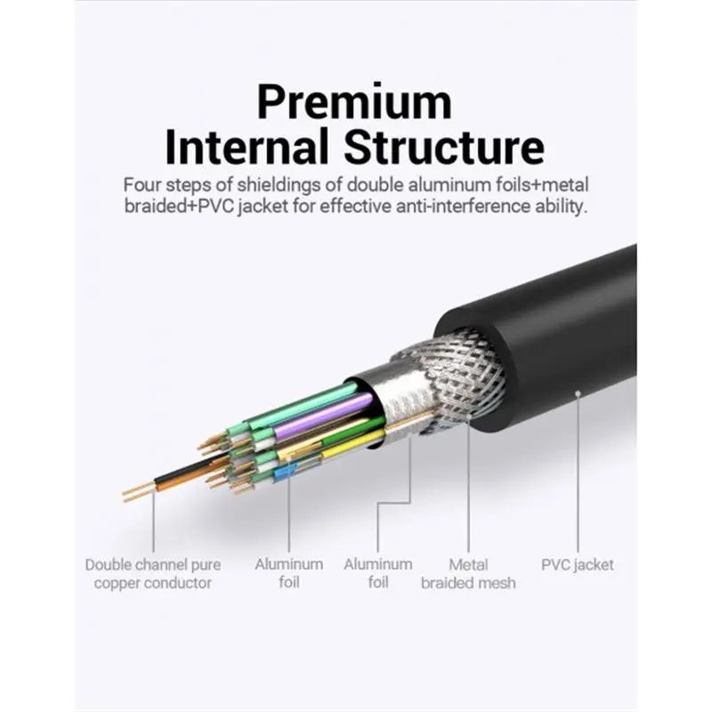 Роздільна здатність 2K 60Hz Без тремтіння / без заставки / без ореолів Позолочений інтерфейс Антиоксидант, без іржі, чутливий до контакту Мідний сердечник високої чистоти Подвійна алюмінієва фольга захищає стабільне зображення без спотворень Магнітне кільце із захистом від перешкод Ефективно екранує електромагнітні перешкоди EMI/FRI М’який та гнучкий Екологічна куртка з ПВХ, міцна та довговічна.