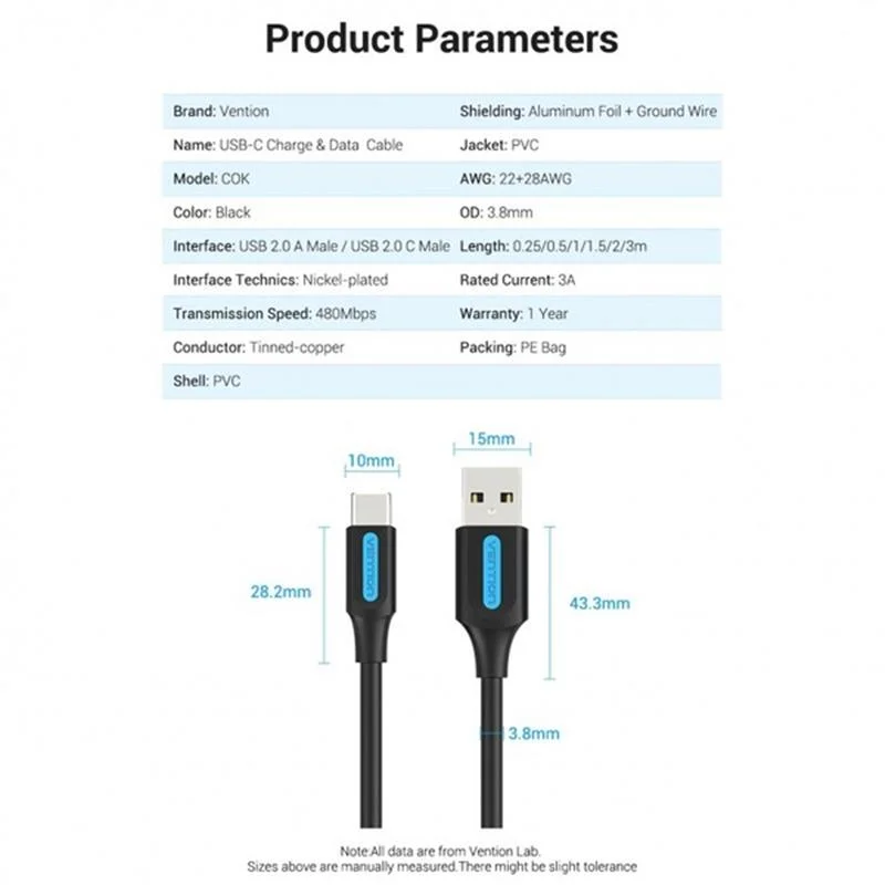 Кабель Vention USB Type-C - USB (M/M), 2 м, Black (COKBH)