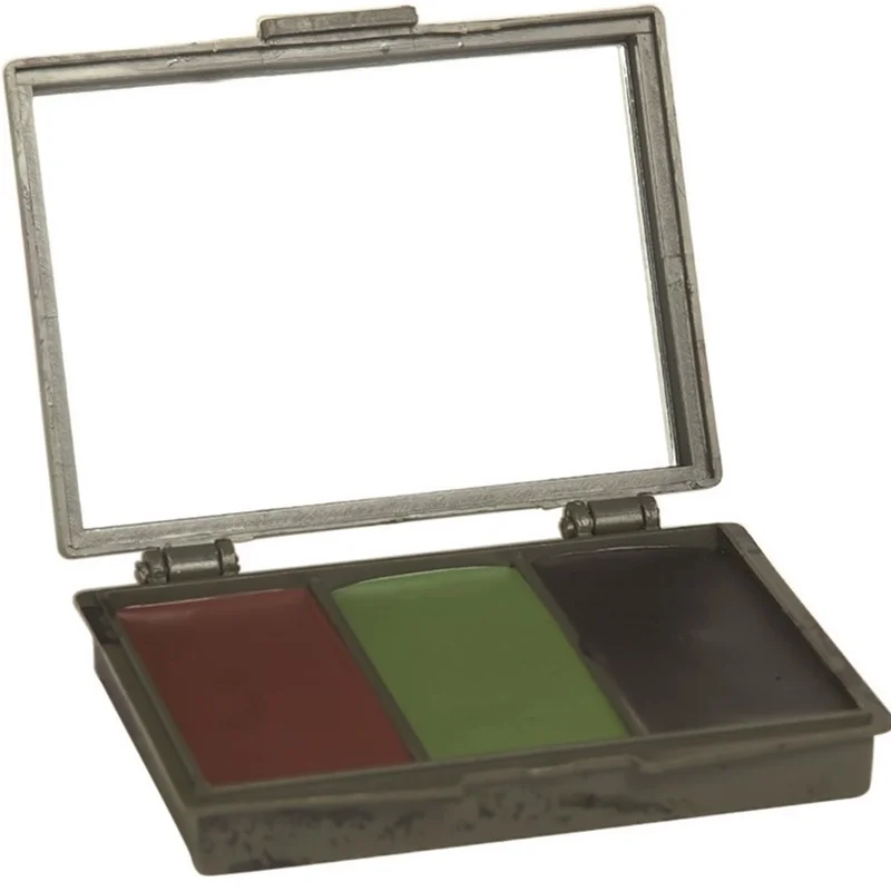 Размеры: 7,5 х 6 х 2 см. Содержимое в мл: 26 мл. Особенности: Три цвета (черный, коричневый, темно-зеленый); В практичной пластиковой коробке; С зеркалом; Долговечные и универсальные; Легко наносится; Легко снимается; Замаскируйте лицо и руки полосами или узорами.