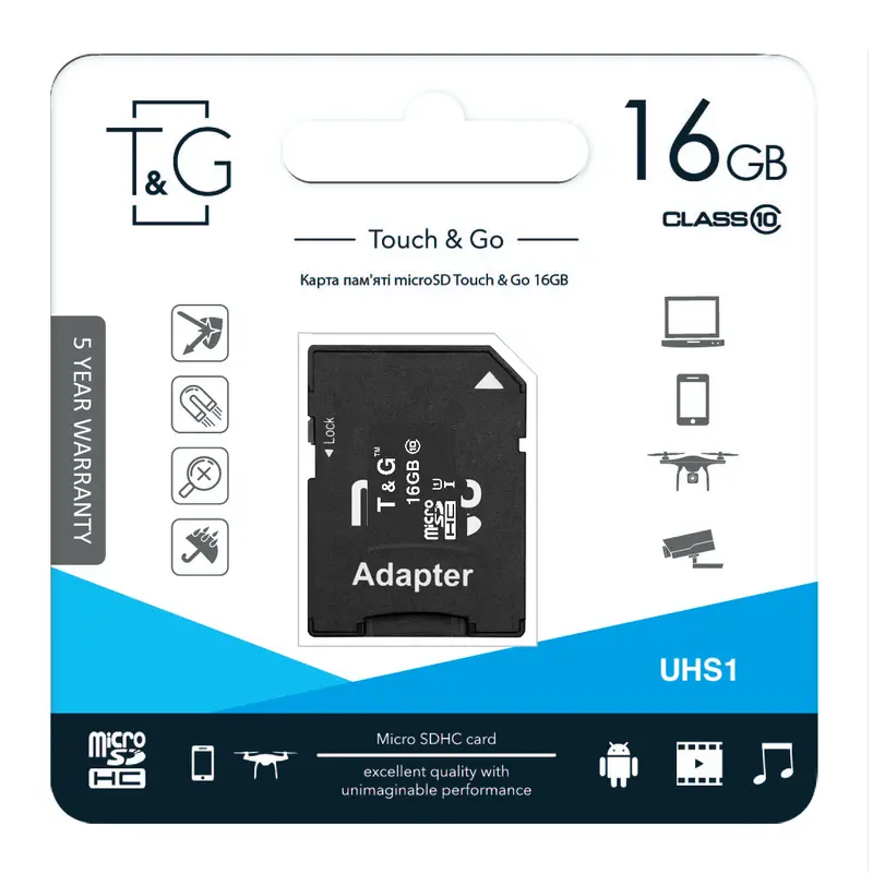 Карта пам"яті T&G microSD (UHS-1) (micro SECURE DIGITAL High Capacity). Сумісна з усіма пристроями читання і запису флеш-карт стандарту microSD, такими як мобільні телефони, комунікатори, MP3-плеєра і т.п.