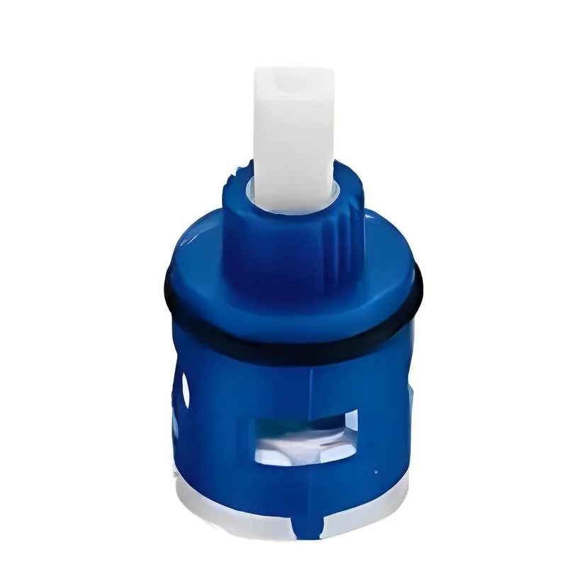 Картридж для смесителя представлен пластмассовым цилиндром небольшого размера, в верхней части которого расположен шток, а в нижней - три отверстия. Через них поступает холодная и горячая вода. Картридж предназначен для регулировки напора и температуры воды.