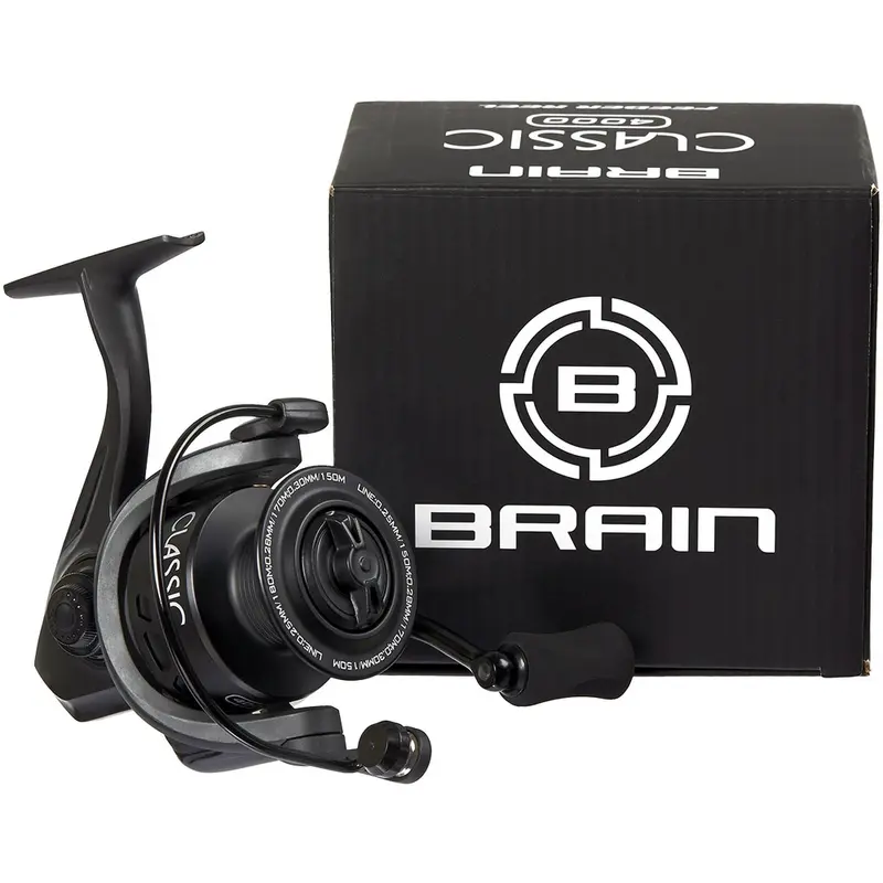 Котушка Brain Classic – бюджетна модель для фідерної, а в деяких випадках і для спінінгової риболовлі. Вона володіє підвищеним тяговим зусиллям, що допоможе впоратися з вимотуванням важкого оснащення або з виведенням великої риби. Внутрішній механізм налічує 4 шарикопідшипника – два на осі провідної шестерні, один на веденій і ще один у ролику жилковкладача, завдяки чому продовжується його термін служби. Шпуля котушки має глибокий профіль, що дозволяє вмістити достатній запас волосіні або шнура. Вона виконана з алюмінію, її передній бортик має скошену форму для забезпечення вільного вильоту оснастки. Кругла латунна кліпса, що встановлена на шпулі, має конструкцію із пружиною і оснащена пластиковою підкладкою, завдяки чому не буде пошкоджувати шнур під час фіксації дистанції лову в фідерної риболовлі. У котушці реалізована сама надійна система кріплення ручки – вона угвинчується безпосередньо у вісь провідної шестерні, що виключає утворення люфтів в цьому вузлі. Котушка Brain Classic випускається в чотирьох типорозмірах, де 3000 і 4000 можуть встановлюватися на пікерні і легкі фідерні вудилища або потужні спінінги, а 5000 і 6000 підійдуть для важких фідерів з тестом до 180 грам.