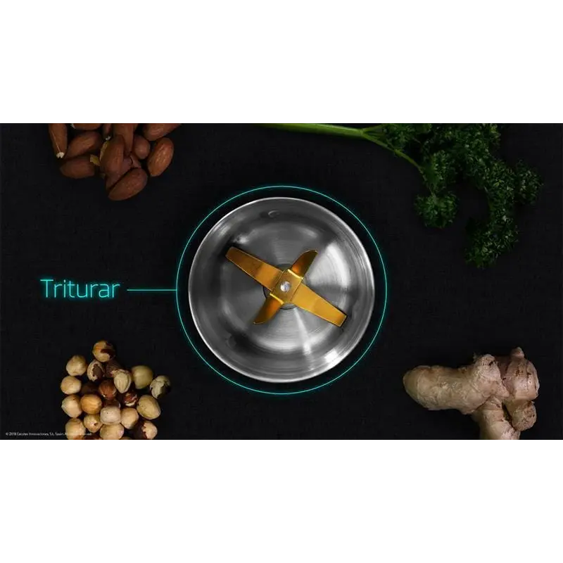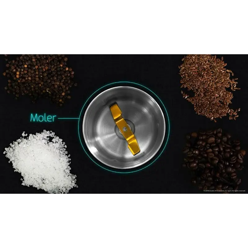 Подрібнюйте ароматні кавові зерна, тверді горішки та різноманітні спеції легко і швидко! Кавомолка CECOTEC Compact Titanmill 300 DuoClean вміє створити різний ступінь помелу - від ніжного до грубого. Компактна і надійна, вона просто незамінна на кухні. Двигун потужністю 300 Вт. 2 окремі ємності для різних продуктів Корпус із нержавіючої сталі Надійний мотор - швидкий результат Роторний двигун потужністю 300 Вт з легкістю подрібнює навіть тверді інгредієнти. Кава, горіхи, сіль, спеції, свіжа зелень - він впорається з усім. Ви можете змолоти кожен продукт окремо, або приготувати суміш: результат буде ідеальним. Міцний сталевий корпус. Нержавіюча сталь напрочуд довговічна і проста в догляді. Вона стійка до ударів і впливу рідин. Тільки протріть корпус - і все чисто. А обидві чаші і прозору металеву кришку досить промити під водою, як звичайний посуд. Дві чаші. Використовуйте 2 резервуари, щоб зберегти аромат різних продуктів. Контейнер для кавових зерен та окрема чаша для помелу спецій дають змогу розділити інгредієнти. Обидві вміщують до 90 грамів інгредієнтів. При цьому запахи не змішуються, а готувати вдвічі комфортніше. Два типи титанових лез. Леза цієї кавомолки мають особливу конструкцію. У ємності для вологих продуктів передбачено 2 довгих і 2 коротких ножі, які захоплюють і ефективно подрібнюють всю масу до однорідної суміші. Використовуйте її для приготування зелені, спецій, горіхів, імбиру тощо. В іншій чаші - 2 леза для подрібнення сухих продуктів: кави, солі, борошна. Титанове покриття надає їм особливої міцності. Такі ножі довго залишаються гострими без додаткового заточування. Управління в один клік. Завантажте продукти і натисніть на кришку. Це все, що потрібно зробити для перемелювання. А розмір шматочків - справа часу: чим довше натискаєте, тим вони дрібніші. Регулюйте ступінь подрібнення. Ви можете подрібнити продукти до однорідної маси або залишити апетитні шматочки. Через прозору чашу видно все. Просто стежте за процесом помелу і контролюйте час, щоб отримати саме ту консистенцію, яка потрібна для вашої страви. Міжнародні нагороди. Завдяки високим технічним характеристикам і актуальному дизайну кухонну техніку CECOTEC відзначено престижними нагородами у сфері споживчих товарів. Універсальний дизайн. Сріблястий метал і чорний пластик - справжня кухонна класика. Завдяки такому поєднанню кавомолка впишеться в будь-який інтер'єр. Невеликі елементи блакитного кольору додають цікавого акценту. А продумана конструкція дозволяє працювати на будь-якій горизонтальній поверхні, адже прогумовані ніжки не будуть ковзати. Що в комплекті? Кавомолка поставляється з чашею для помелу спецій і кави, чашею для помелу твердих і вологих продуктів, кришкою та інструкцією з використання.