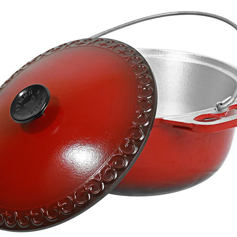 Котел похідний 2-л - АЗІАТКА, з високою кришкою (з орнаментом), потовщеними стінками та дном, жаростійкою ручкою кришки та металевою дужкою для багаття, із зовнішнім склоемалевим покриттям, арт. ЭКАД02