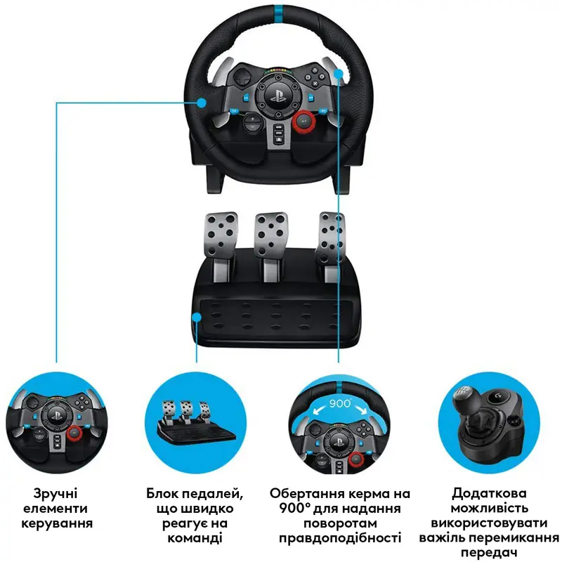 СПРАВЖНЄ КЕРМО Руль правдиво відтворює відчуття від процесу водіння. Механізм зворотного зв'язку через зусилля зі здвоєним електродвигуном точно передає ефект бічного відведення коліс і особливості поверхні, якою здійснюється рух. Вал кермового керування встановлений на сталевих кулькопідшипниках. Завдяки цьому він вирізняється високою міцністю, а його вага відповідає параметрам рулів справжніх машин. Педалі та важелі з неіржавкої сталі дають змогу точно відтворити зусилля, необхідні для керування автомобілем. Кермове колесо зі шкіряним покриттям ручного виготовлення дає гравцеві змогу відчути зручність водіння найрозкішніших машин. Плавність і безшумність роботи забезпечуються завдяки застосуванню косотрибової передачі. ПЕДАЛІ РЕГУЛЮЮТЬСЯ Окремий підлоговий блок із вбудованими педалями газу, гальма та зчеплення забезпечить відповідне розташування тіла для більш реалістичних відчуттів. Пристрої Driving Force дають змогу легко та зручно змінювати швидкість і перемикати передачі. З ними ви зможете відчути себе за кермом справжнього автомобіля. АЗАРТ ВІД ШВИДКІСНОЇ ЇЗДИ Спеціальний важіль перемикання передач дасть вам змогу пережити максимально реалістичні відчуття від перегонового симулятора. Його відрізняють короткий хід під час перемикання 6 передач (для ввімкнення задньої треба втопити важіль вниз) і траєкторія перемикання швидкостей, що схожа на букву «Н». Важіль перемикання передач Driving Force від Logitech G стане незамінним помічником у подорожах віртуальними дорогами.