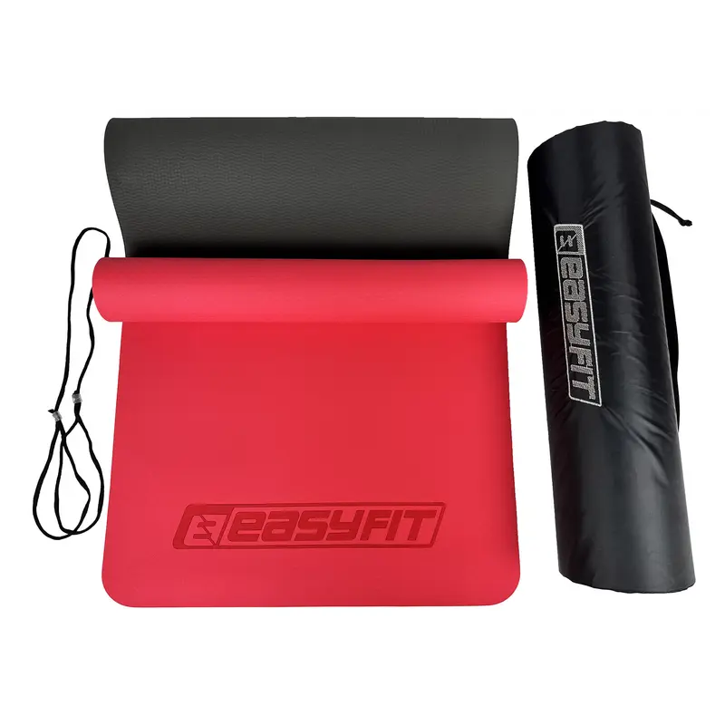 Килимок для йоги та фітнеса EasyFit TPE+TC 6мм двошаровий + Чохол червоний з чорним