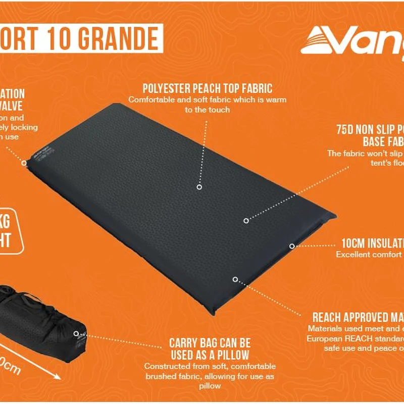 Vango Comfort 10 Grande Shadow Grey (SMQCOMFORS32M1O) - розкішний одномісний самонадувний килимок зі стильним флокованим верхом і міцною нековзною основою, відрізняється неперевершеним комфортом і зручністю. За допомогою клапана Cyclone Flip Valve надування і спуск повітря відбувається набагато швидше та простіше, ніж при використанні традиційних клапанів: просто відкрийте клапан та спостерігайте, як килимок розширюється. Віддаєте перевагу більш жорсткому килимку, тоді додайте трохи повітря. Після нічного сну великий отвір клапана Cyclone Flip Valve сприяє швидкому виходу повітря із килимка, що спрощує його упаковку.