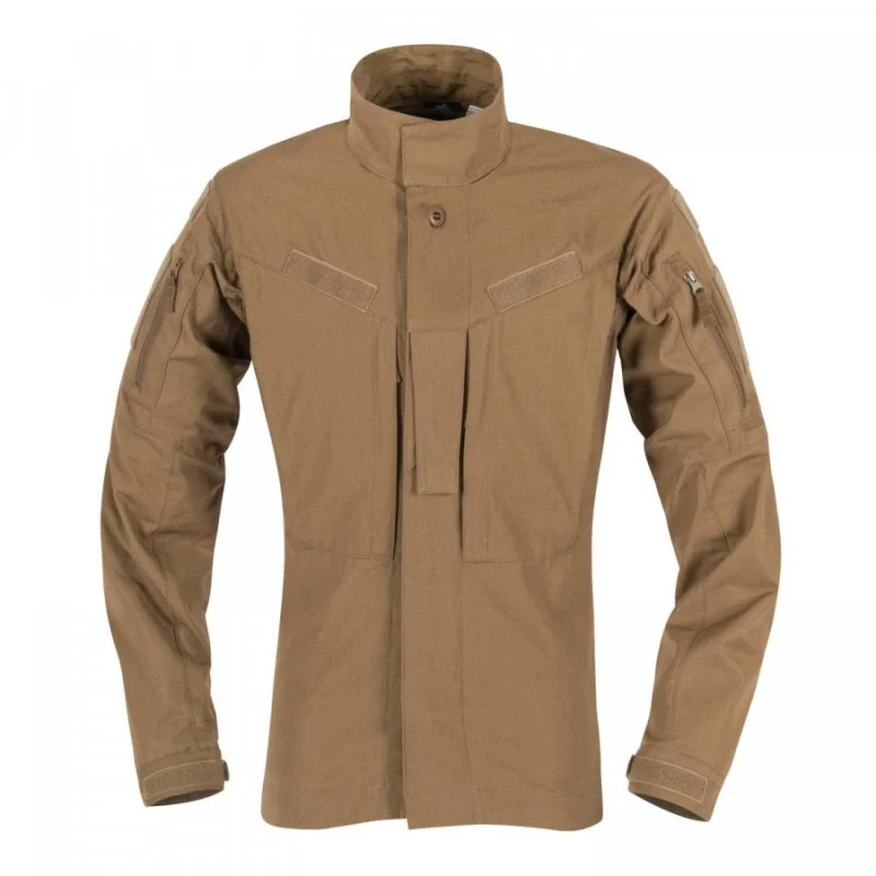 HELIKON-TEX® Китель MBDU (Modern Battle Dress Uniform) є частиною модернізованої польової форми BDU з лінійки HTX Patrol Line. Уніформа MBDU виготовлена ​​з високоякісних тканин (змішаної тканини NyCo Ripstop: 52% нейлону, 48% бавовни, а також еластичного матеріалу VersaStretch®), ретельно підібраних для забезпечення не тільки високої міцності, але і свободи пересування, що є надзвичайно важливим фактором в польових умовах. Кітель має анатомічний крій зі злегка приталеним силуетом і бічними вставками, зробленими з тканини VersaStretch®. Класичний комір можна перетворити в комір-стійку і застебнути липучкою. На грудях є дві кишені на блискавках, а над ними Velcro-панелі для ідентифікаційних патчів. Додатково, в центральній частині є клапан для кріплення муфти рангу. Сітчасті вставки під пахвами забезпечать максимальну повітропроникність. Нарукавні кишені закриваються вертикальними блискавками. На кишенях і над ними пришиті липучки для кріплення емблем і патчів.