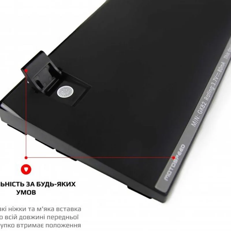 Motospeed робить якість доступною Motospeed й далі дотримується високих стандартів якості та використовує тільки якісні комплектуючі та матеріали. Справжня механіка Механічні перемикачі Outemu, одного з лідерів ринку, надають повний контроль над дією й швидкісне спрацьовування. Витривалі кнопки Вироблені за технологією подвійного лиття під високим тиском із підвісним кріпленням, додає неперевершеною зносостійкості та гарантує тривалість життя понад 50 000 000 натискань клавіш. Стабільність положення За будь-яких умов, клавіатура на своєму місці завдяки протиковзним ніжкам із м’якої гуми.