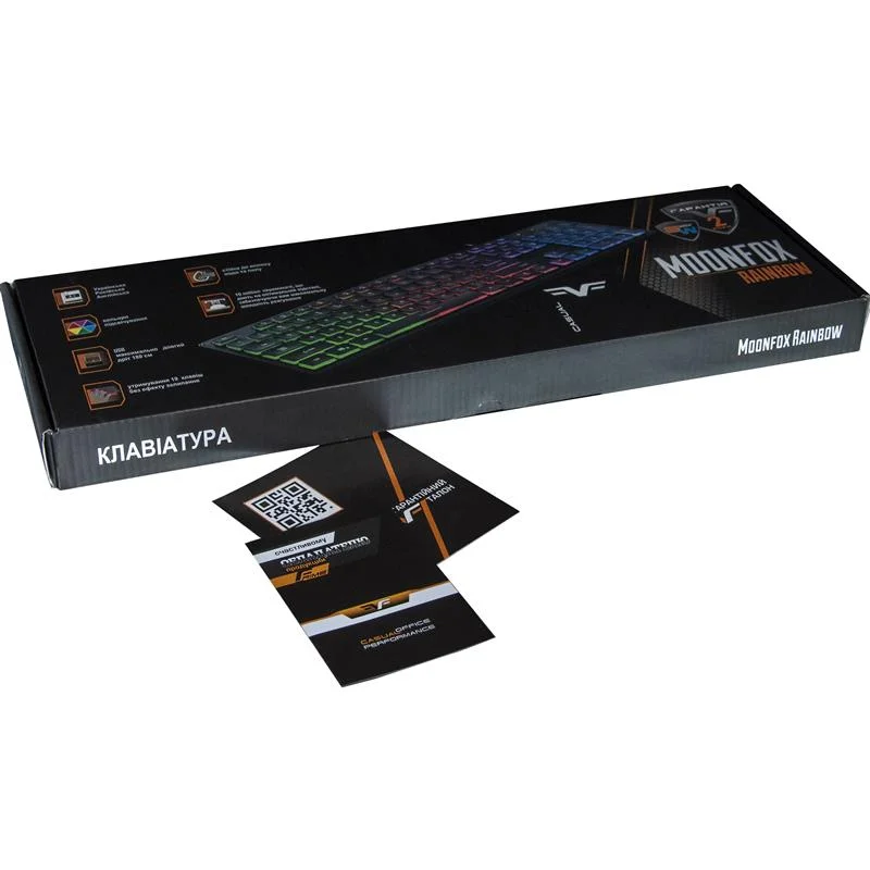Frime Moonfox3Color - клавіатура, яка має масу переваг і корисних функцій. Вона виконана з якісного пластику в чорному кольорі, в класичному дизайні, є досить компактною. Її головна особливість - Rainbow підсвічування клавіш з настроюваної яскравістю (3 рівня яскравості), яка полегшить роботу за рахунок світіння кожної літери. Також у неї є 12 клавіш з додатковою функцією при натисканні FN і кабель 180 см. Клавіатура оснащена 104 клавішами на мембранних перемикачах. Сумісна з Windows, Mac OS, Linux - з переважною більшістю застосовуваних операційних систем. Має підтримку англійської, української та російської розкладки клавіатури. Підключення до комп’ютера здійснюється через USB роз’єм.