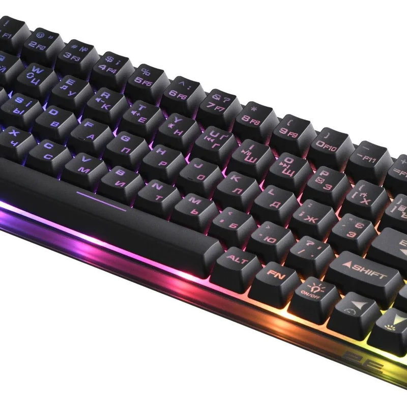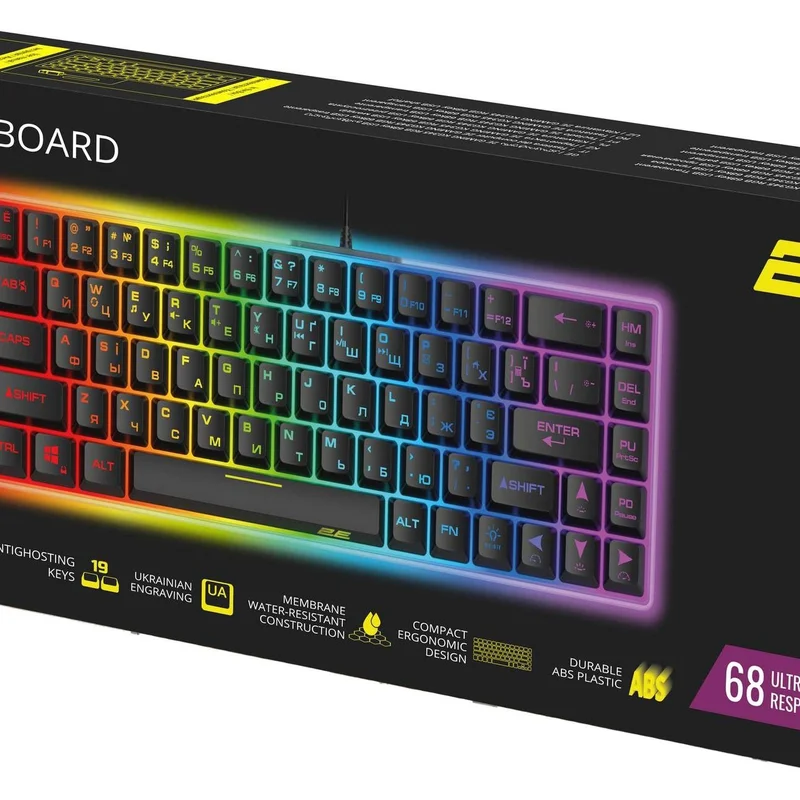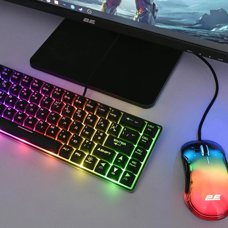 Компактна мембранна клавіатура 2E GAMING KG345 – надійна «зброя» для найзапекліших віртуальних боїв. Модель виконана в популярному форматі 65% і вирізняється неабияким дизайном, що вдало підкреслить сучасний стиль геймера. Але KG345 є оптимальним вибором не тільки для затятих гравців, клавіатура однаково зручна і для роботи, навчання, зокрема набору тексту. 10 мільйонів натискань. Мембранна клавіатура виконана у популярному форматі 65%, має 68 клавіш із ресурсом 10 мільйонів натискань, які миттєво реагують на дії користувача, забезпечуючи комфортну гру або набір тексту. Модель відрізняється м’яким тайпінгом, є українська розкладка. Крім того, передбачено захист від вологи. Клавіатура є сумісною з пристроями, що працюють на базі Windows 11 (і старші версії), Linux, macOS. Функціональні комбінації. Завдяки функціональним комбінаціям клавіш можна керувати гучністю, запускати електронну пошту або улюблений браузер для веб-серфінгу, користуватися калькулятором тощо. Конструкцією передбачено 19 клавіш Anti-Ghosting: найскладніші комбінації будуть коректно оброблені програмним забезпеченням, тому геймер зможе продемонструвати всю свою ігрову майстерність. Магія RGB-підсвічування. Магія концентрується на кінчиках пальців… У прозорому корпусі клавіатури 2E GAMING KG345 вирують різнокольорові спалахи, що гарантують користувачеві найяскравіші враження від ігрового процесу! Для створення переможної атмосфери можна вибрати один із дев’яти режимів підсвічування RGB та налаштувати яскравість та швидкість зміни кольору. Та й це ще не все: також передбачено підсвічування символів, а не лише міжклавішного простору. Прорезиненные складные ножки. Клавиатура изготовлена из прочного ABS-пластика, устойчивость конструкции обеспечивают прорезиненные складные ножки. Кроме того, предусмотрена возможность регулировки аксессуара по высоте (два уровня). KG345 подключается к компьютеру через USB 2.0, длина кабеля составляет 1,8м.