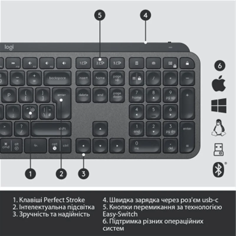 ЛЮДИ, ЯКИМ ІДЕАЛЬНО ПІДХОДЯТЬ ЦІ ПРИСТРОЇ Аналітики, програмісти та представники творчих професій, яким потрібна розширена функціональність. ПЕРЕВАГИ ПРОДУКТУ Повнорозмірна клавіатура Інтегрований цифровий блок, клавіші зі стрілками Інтелектуальна система підсвічування: датчики виявлення руху включають підсвічування при наближенні рук, а датчики освітленості регулюють його яскравість Вимкнення звуку мікрофона, голосове введення та інші налаштувані клавіші F2 Два варіанти бездротового підключення: USB-приймач Logi Bolt та бездротова технологія Bluetooth LE Технологія Logi Bolt працює в Режимі безпеки, Рівень безпеки. Сполучення USB-приймача Logi Bolt виконано на заводі Клавіатура працює від перезаряджуваних літій полімерних батарей. Пристрій можна використовувати під час заряджання (заряджання здійснюється через порт USB-C) За допомогою клавіш Easy-Switch можна легко перемикатися між трьома підключеними комп’ютерами. Функція Logitech Flow — це можливість працювати одночасно на кількох комп’ютерах з різними ОС та переміщувати файли між ними До одного приймача Logi Bolt можна підключати до шести пристроїв Logi Bolt