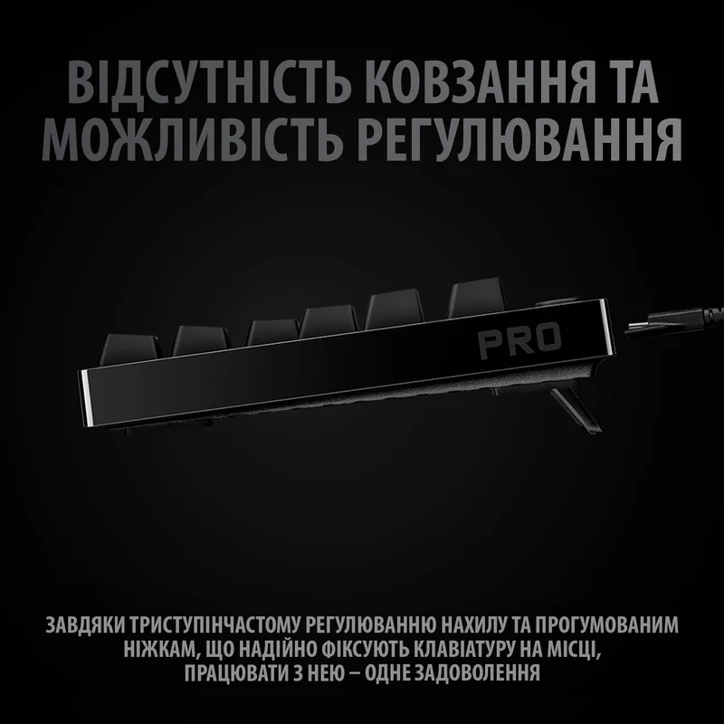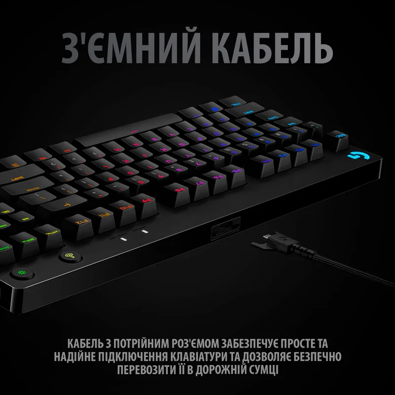 Представляємо вашій увазі новий варіант ігрової клавіатури PRO, що чудово зарекомендувала себе на численних ігрових турнірах. Відмінною рисою цієї моделі є інноваційні механічні перемикачі GX, що видають клацання при спрацьовуванні. Завдяки відсутності цифрового блоку ця клавіатура абсолютно не обмежує користувача при роботі з мишею, а знімний кабель забезпечує зручне перевезення пристрою, що особливо важливо для гравців, що беруть участь у виїзних турнірах по всьому світу. Система підсвічування дає можливість візуально виділити важливі клавіші або наочно підкреслити приналежність гравця до певної команди. Ефекти і анімацію підсвічування можна налаштувати за допомогою ПЗ G HUB. Крім того, воно дозволяє зберігати статичні схеми підсвічування у вбудованій пам’яті пристрою для подальшого використання на турнірах.