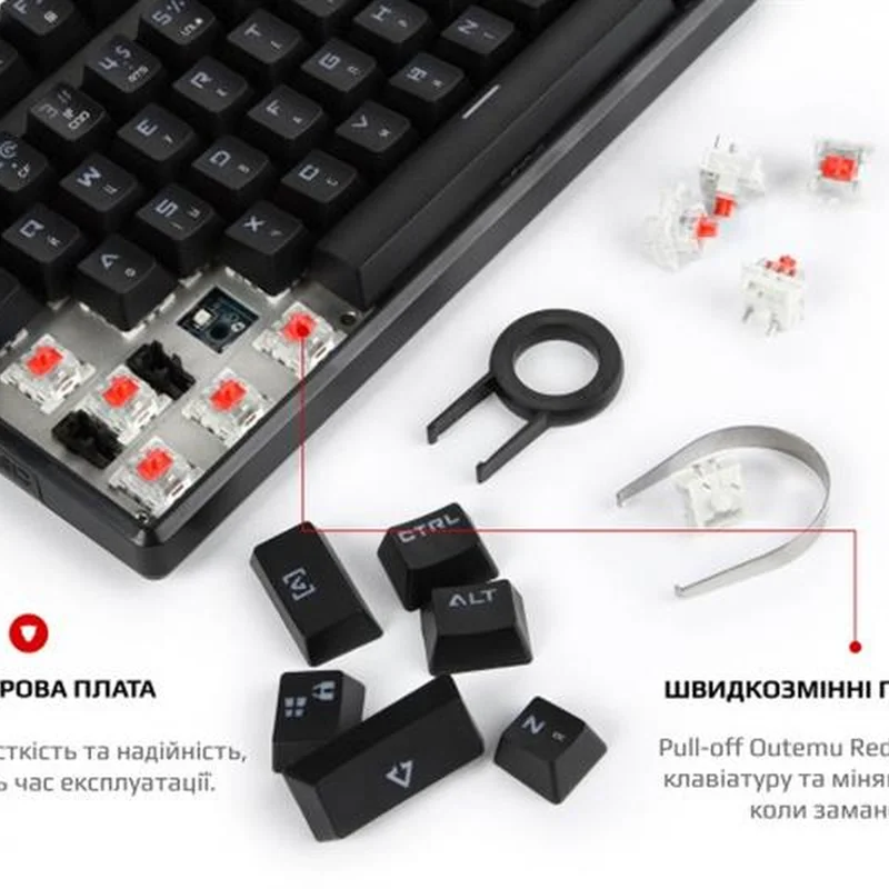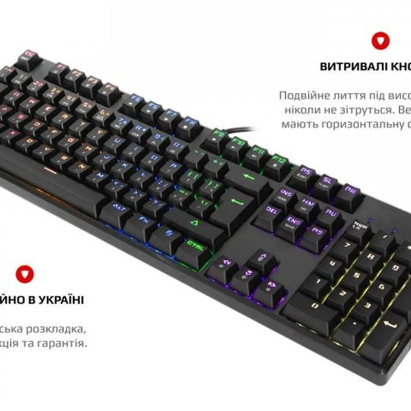 Професійний інструмент для твоєї перемоги Ретельно продумана та спроектована з увагою до дрібниць. Компактна клавіатура з повноцінним підсвічуванням та індивідуальним стилем. Справжня механіка Механічні перемикачі Outemu одного з лідерів ринку, надають повний контроль над дійством та надшвидке спрацювання. Надійність, довговічність та точність повторення зусилля натискання один до одного від партії до партії. Збільшений ресурс роботи та покращений захист від окислення за рахунок унікальної конструкції перемикача. Програмування та макроси Програмне забезпечення з інтуїтивно зрозумілим інтерфейсом за допомогою якого можливо налаштувати макроси, підсвічування та інше. Більше ніяких промахів, завжди в ціль! Висока точність спрацювання механічних перемикачів завжди в тій самій точці ходу перемикача, для будь-якої кнопки. Витривалі кнопки Виконані за технологію подвійного лиття під високим тиском з підвісним кріпленням, що додає неперевершеної зносостійкості та гарантує тривалість життя до 50 мільйонів натискань клавіш. Великі кнопки мають подвійний підвіс та горизонтальну стабілізацію. NKRO та Anti Ghosting Вбудований ігровий чіп виключає будь-які випадковості. Блокування клавіші Windows задля запобігання виходу з ігрової сесії. Індивідуальні налаштування RGB Окрім 14 режимів світлових ефектів та ігрових режимів, з регулюванням яскравості та швидкості, є можливість налаштування індивідуальних ігрових режимів підсвічування. Двошарова плата Неперевершена якість монтажу та додаткова жорсткість. Значно більший час експлуатації навіть для самих емоційних гравців в самих екстремальних ситуаціях. Панель з алюмінієвого сплаву Гарантує жорсткість та цілісність конструкції. Виключає люфти, скрипи та неприємний брязкіт пластикових корпусів. Безперебійність передачі даних Високоякісний м'який кабель та позолочений USB роз'єм забезпечують якість контакту та безперебійність передачі даних, а застібка допоможе організувати кабелі на робочому столі та у подорожі. Стабільність положення За будь-яких умов, клавіатура на своєму місті завдяки протиковзким ніжкам з м'якої гуми.