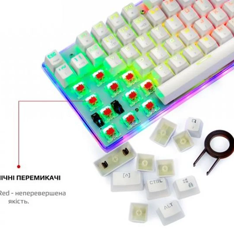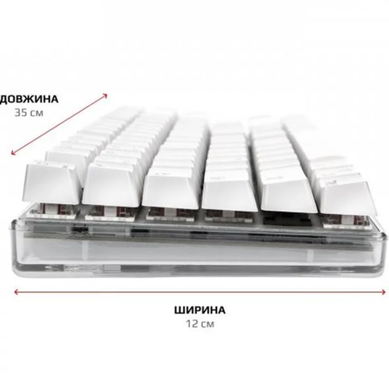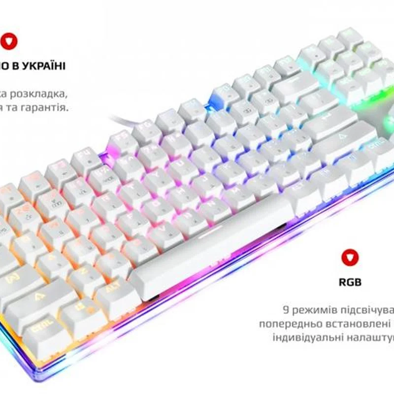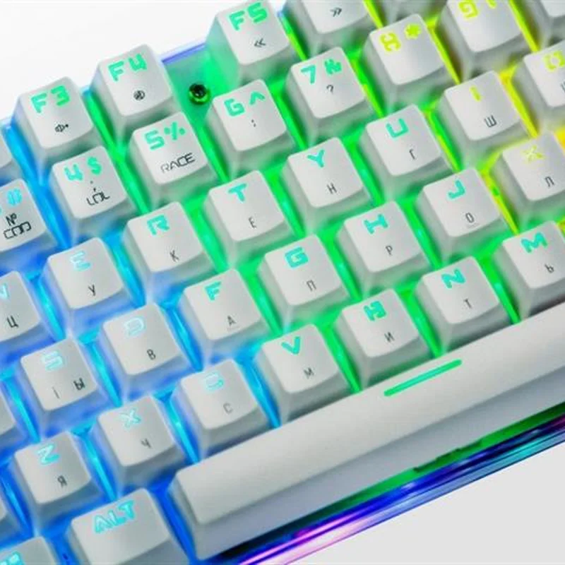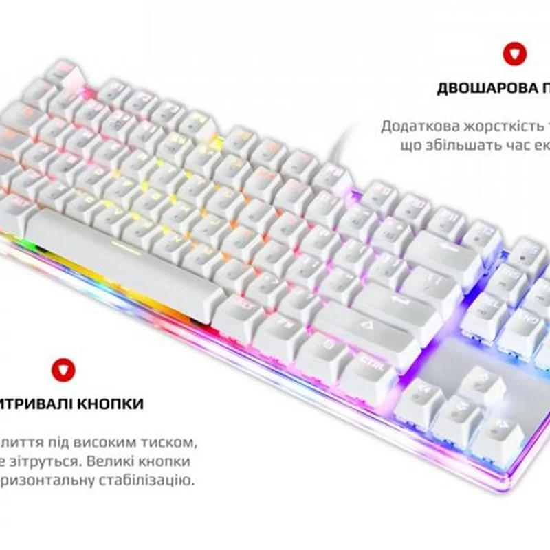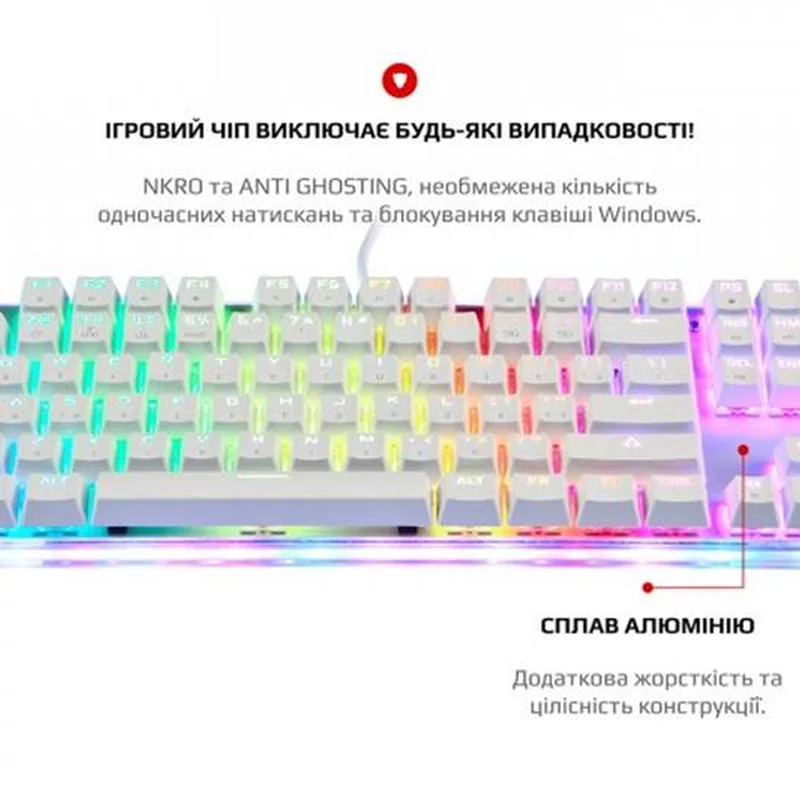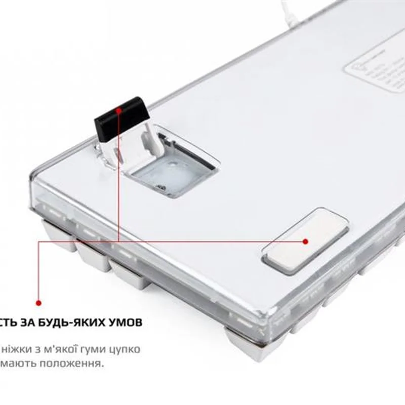 Унікальна індивідуальність Ретельно продумана та спроектована. Компактна клавіатура з повноцінним підсвічуванням включаючи підсвічування прозорого корпусу по контуру. Справжня механіка. Механічні перемикачі Outemu одного з лідерів ринку, надають повний контроль над дійством та надшвидке спрацювання. Надійність, довговічність та точність повторення зусилля натискання один до одного від партії до партії. Збільшений ресурс роботи та покращений захист від окислення за рахунок унікальної конструкції перемикача. Більше ніяких промахів, завжди в ціль! Висока точність спрацювання механічних перемикачів завжди в тій самій точці ходу перемикача, для будь-якої кнопки. Витривалі кнопки. Виконані за технологію подвійного лиття під високим тиском з підвісним кріпленням, що додає неперевершеної зносостійкості та гарантує тривалість життя до 50 мільйонів натискань клавіш. Великі кнопки мають подвійний підвіс та горизонтальну стабілізацію. NKRO та Anti Ghosting Вбудований ігровий чіп виключає будь-які випадковості. Блокування клавіші Windows задля запобігання виходу з ігрової сесії. Індивідуальні налаштування RGB Окрім 9 видів світлових ефектів та ігрових режимів, з регулюванням яскравості та швидкості, є можливість налаштування індивідуальних ігрових режимів підсвічування. Двошарова плата. Неперевершена якість монтажу та додаткова жорсткість. Значно більший час експлуатації навіть для самих емоційних гравців в самих екстремальних ситуаціях. Панель з алюмінієвого сплаву Гарантує жорсткість та цілісність конструкції. Виключає люфти, скрипи та неприємний брязкіт пластикових корпусів. Безперебійність передачі даних Високоякісний м’який кабель та позолочений USB роз’єм забезпечують якість контакту та безперебійність передачі даних, а застібка допоможе організувати кабелі на робочому столі та у подорожі. Стабільність положення За будь-яких умов, клавіатура на своєму місті завдяки протиковзким ніжкам з м’якої гуми.