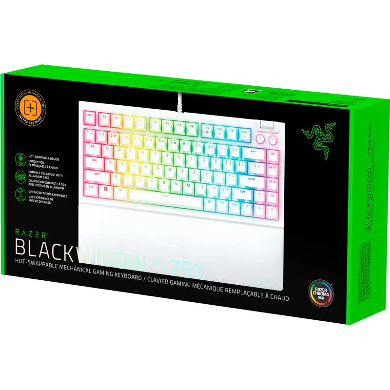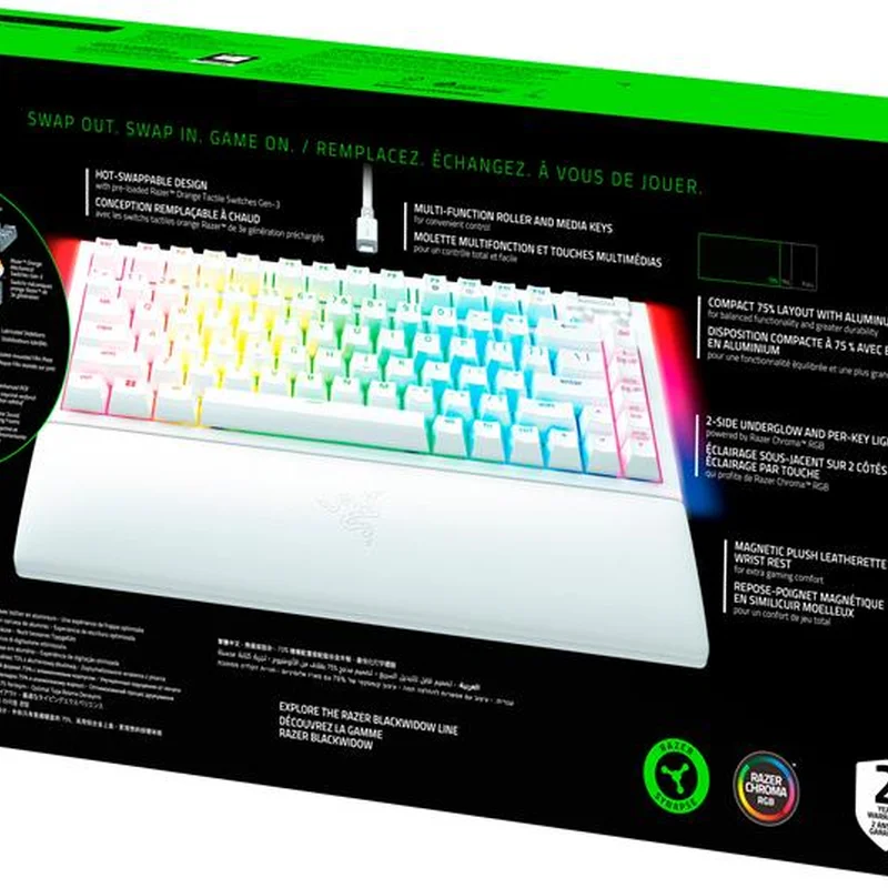 Razer BlackWidow V4 75% — це компактна механічна клавіатура з можливістю «гарячої» заміни перемикачів і підсвічуванням Razer Chroma RGB, яка доведеться вчасно ентузіастам, що шукають ширші можливості індивідуального налаштування та занурення. Від встановлення нових перемикачів до створення унікальних світлових ефектів — тепер ви можете визначити, як виглядатиме ваша улюблена ігрова клавіатура. Можливість «гарячої» заміни перемикачів із встановленими помаранчевими тактильними перемикачами Razer 3-го покоління Гніздова конструкція друкованої плати цієї клавіатури сумісна з 3- або 5-контактними перемикачами, що дозволить легко замінити встановлені перемикачі на свої власні для досягнення потрібних тактильних якостей. Компактний формат 75% з алюмінієвим корпусом для збалансованої функціональності та більшої міцності Компактний формат цієї клавіатури ідеально підходить для мінімалістичних ігрових місць і невеликих столів, але вона оснащена функціональними клавішами та клавішами зі стрілками для забезпечення необхідної функціональності. Покращені відчуття від друку з приємною акустичною складовою Порадьтеся збалансованому ходу та приємному звуку клавіш завдяки змонтованому на ущільнювальних прокладках плейту з FR4, шумоізольованій друкованій платі, покритим мастилом стабілізаторам та двом шарам звукопоглинаючої піни. Двостороннє підсвічування основи з індивідуальним підсвічуванням клавіш на базі Razer Chroma RGB Ця клавіатура оснащена індивідуальним підсвічуванням клавіш і яскравим двостороннім підсвічуванням основи. Синхронізувавши підсвічування клавіатури та підсвічування своєї ігрової станції, ви зможете відчути ще більший ефект занурення в сотнях інтегрованих ігор. Багатофункціональне колесо та мультимедійні клавіші для зручного керування Зупиняйте, відтворюйте, пропускайте треки та регулюйте будь-який параметр – від яскравості до гучності. Насолоджуйтесь улюбленими розвагами з повною зручністю. Магнітна підставка під зап’ястя із високоякісної штучної шкіри для особливо комфортної гри Завдяки м’якій та пружній підставці під зап’ястя, яка надійно пристібається до клавіатури, ви насолодитеся тривалим комфортом, який допоможе вам у найскладніших ігрових марафонах.